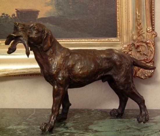Retriever - Hunting Dog, Bronze Sculpture, After Barye, 12"H x18"W x 6"D18 lbs This bronze sculpture was produced using the "Lost Wax" casting method. The"Lost Wax" Cast method is the most precise metal casting technique in existence, ensuring exquisite detail of the original host model which is usually sculpted in clay or wax. This "Lost Wax" casting method is an extremely labor intensive and expensive process, but the end results produce a Heirloom Quality Masterpiece!Antoine-louis Barye (1796 - 1875) Originally trained as a goldsmith, Antoine-Louis Barye served in Napoleon's army before studying sculpture and painting. He entered the Ecole des Beaux-Arts in 1818 and adapted the romantic-style subject matter of violent and majestic animals. After his crocodile-like sculpture entitled Tiger Devouring a Gavail, won a medal at the Salon of 1831, Barye became a successful and independent sculptor and painter. His animal sculptures competed at the Salon alongside the more traditional and revered human figures. In 1845, Barye began a foundry that produced smaller and more affordable bronze statues. He was appointed the keeper of plaster casts at the Louvre and professor of zoological drawing at the Musee National d'Histoire Naturelle, both in Paris. Elected to the Academie in 1868, Barye inspired a later generation of animal sculptors who called themselves the animaliers.A retriever is a type of gun dog that retrieves game for a hunter. Generally gun-dogs are divided into three major classifications: retrievers,flushing spaniels, and pointing breeds. Retrievers were bred primarily to retrieve birds or other prey and return them to the hunter without damage. Although spaniels and some pointing breeds routinely retrieve game, and many retrievers are skilled in finding game, retrievers are distinguished in that non-slip retrieval is their primary function. As a result, retriever breeds are bred for soft mouths and a great willingness to please, learn, and obey. A soft mouth refers to the willingness of the dog to carry game in its mouth without biting into it. "Hard mouth" is a serious fault in a hunting dog and is one that is very difficult to correct. Newfoundlands are very nice retrievers although the name doesn't say they are soft mouthed-willing to retrieve dogs. Many retriever dogs are willing to please and are very loyal and good tempered like the labrador retriever, golden retriever and newfoundland.