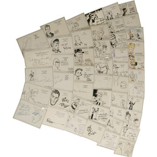 <B>Great Cartoonists Signed Notecards Group.</B></I> An impressive set of 3" x 5" notecards, collected during the 1940s, features signatures from (and in most cases, artwork by) from 48 great cartoonists, among them Lee Falk (creator of "The Phantom"), Mike Roy ("The Saint"), Robert L. Ripley ("Believe It or Not"), Frank O. King ("Gasoline Alley"), Pulitzer-Prize winner Bill Mauldin ("Up Front with Mauldin"), Bud Fisher ("Mutt and Jeff"), Walter Lantz ("Woody Woodpecker"), and Frank Martinek ("Don Winslow"). Each is enclosed in a protective mylar sleeve, and the set is in overall Excellent condition with the occasional instance of very light tanning. A fantastic set of collectibles.