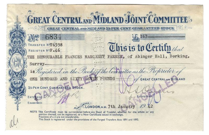 1942, London, England. 3 ½ Per Cent Guaranteed Stock certificate for 167 Pounds. Blue text on white paper. Issued to “The Honourable Frances Margaret Farrer, of Abinger Hall, Dorking, Surrey”. Dam Frances Margaret Farrer, DBE (1895 – 1977). Secretary of the NUSEC and later General Secretary of the Women’s Institute (NFWI) in 1929. Dame of the British Empire in 1950. Stamp and punch cancelled and very fine