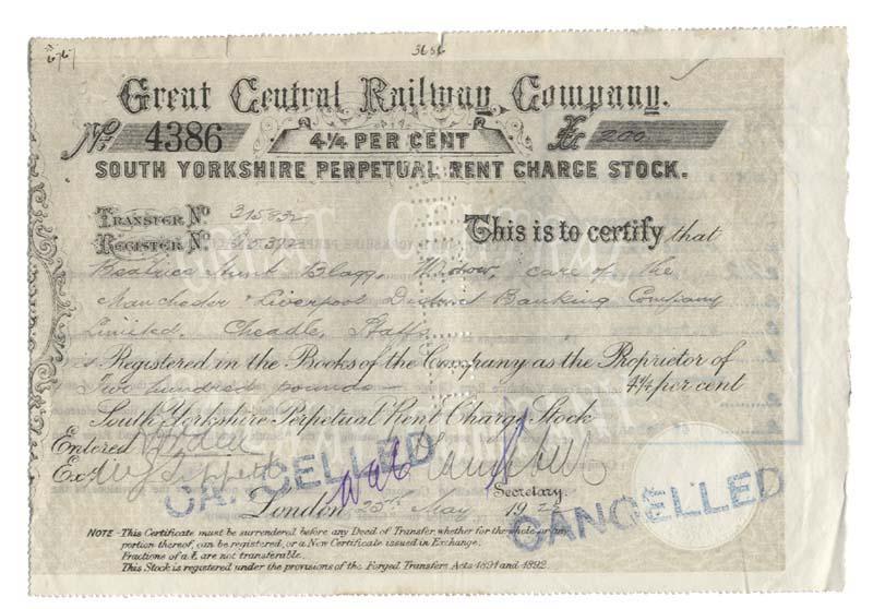 1922, England. 4 1/4% South Yorkshire Perpetual Rent Charge Stock. Black/Tan. Lightly stamp and punch cancelled. Very Fine.