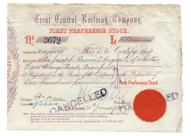 1908. London, England. First Preference Stock. Purple/Red. Lightly stamp and punch cancelled. Very Fine.