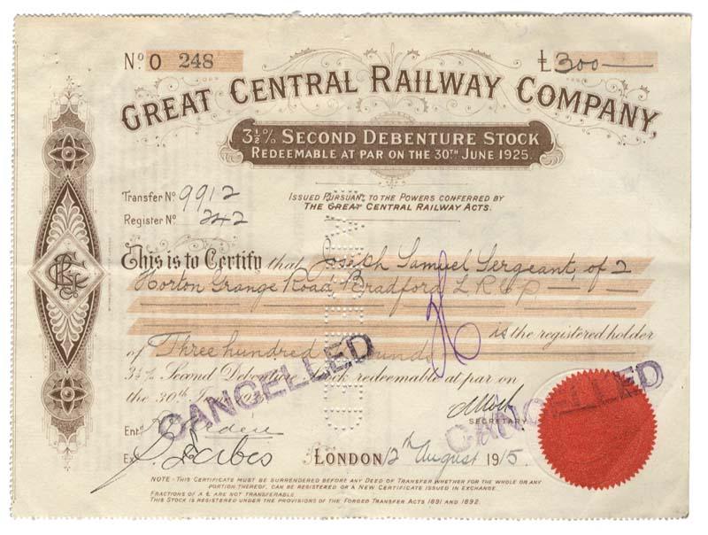 1915, London, England. 3 1/2% Second Debenture Stock. Redeemable at Par on the 30th June 1925. Brown with red embossed seal. Lightly stampand punch cancelled. Extremely Fine.