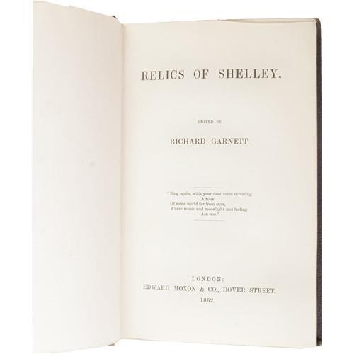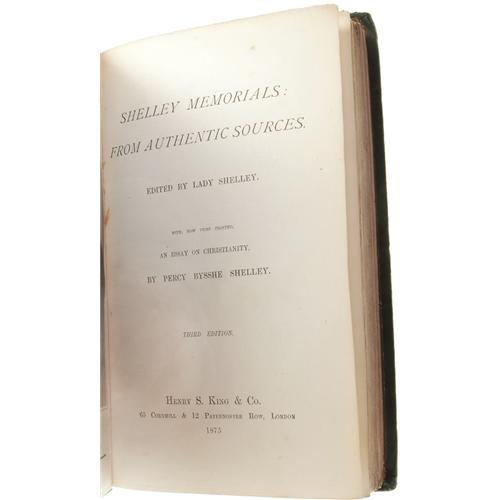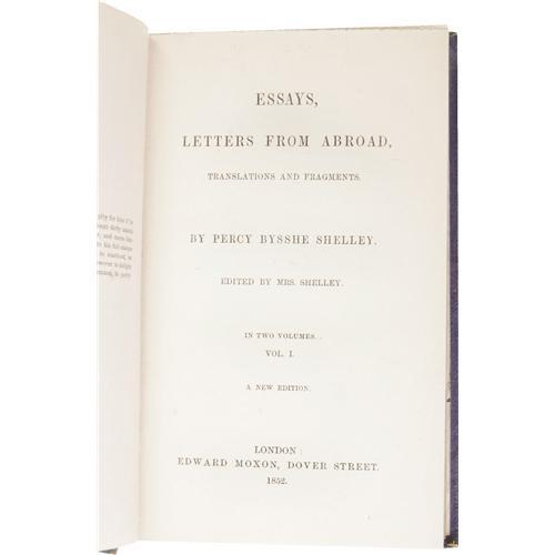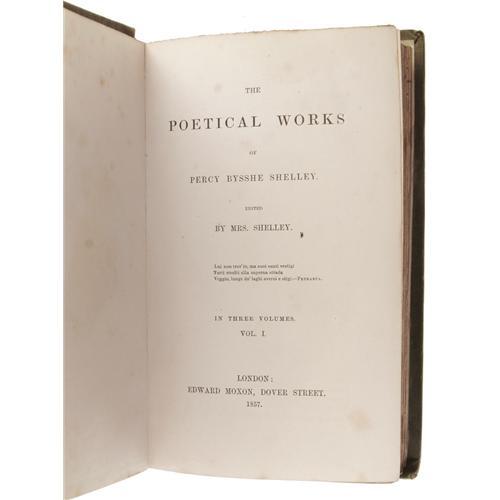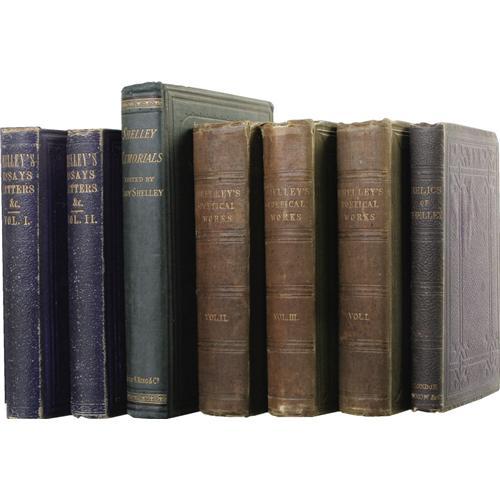 <B>Great Collection of Shelley-Related Books, Most Edited by Mary Shelley and Published by Edward Moxon.</B></I> Edward Moxon, 1801-1858, was a British poet and publisher. In 1826, he published a volume of his own work, <I>The Prospect, and other Poems.</B></I> In 1830, Moxon started as a London publisher on New Bond Street. The first volume he produced was Charles Lamb's <I>Album Verses.</B></I> Moving to Dover Street, Piccadilly, Moxon published an illustrated edition of Rogers's <I>Italy,</B></I> for which £10,000 was spent upon the illustrations. Wordsworth entrusted him with the publication of his works from 1835 onwards, and in 1839 he issued the first complete edition of Shelley's poems and continued to publish many of both Percy and Mary Shelley's works.<BR><BR>Some passages in Shelley's <I>Queen Mab</B></I> resulted in a charge of blasphemy being made against Moxon in 1841. The case was tried, the jury returned a guilty verdict and the offensive passages were expunged. Moxon continued to publish Robert Browning, Richard Monckton Milnes, Tom Hood, Barry Cornwall, Lord Lytton, Browning and Alfred Tennyson. This lot offers three titles published by Moxon's publishing firm, in addition to a wonderful book of Shelley memorials.<BR><B><I>The Poetical Works of Percy Bysshe Shelley</B></I></B></I> <B>Edited by Mrs. Shelley,</B></I> (London: Edward Moxon, 1857), three volumes, 12mo (4.5" x 7"), green cloth binding with decorative blind-stamping on the boards, and gilt lettering on the spine. Mary Shelley dedicated this collection to Percy Florence Shelley, progeny of herself and Percy Bysshe Shelley. All volumes display shelf wear to the head and tail of the spine and edges, with bumped corners. Volume I: 376 pages, boards and spine all but detached, foxing present on front flyleaves to the title page and on the back few pages. Otherwise, the textblock is fairly free of foxing and tight; Volume II: 432 pages, textblock clean, with mild foxing on a few pages. Binding is tight; Volume III: 386 pages, followed by a one-page advertisement, front hinge starting to separate, with previous owner's pencil notations on front endpapers. Textblock is tight, and fairly free of foxing.<BR><B>Richard Garnett: <I>Relics of Shelley</B></I>,</B></I> (London: Edward Moxon & Co., 1862), 191 pages, followed by two pages of advertisements, with eight pages of advertisements in front, 12mo (4.5" x 7"), blue cloth, with gilt lettering on the spine edges of boards and spine sunned, corners bumped, head and tail of spine bumped, textblock clean, previous owner's handwriting on half title page, dated 1862.<BR><B>Percy Bysshe Shelley: <I>Essays, Letters, from Abroad,</B></I></B></I> <I>Translations and Fragments</B></I><B>, Edited by Mrs. Shelley,</B></I> (London: Edward Moxon, 1852), two volumes, 16mo (4.5" x 6..875), blue cloth binding with decorative blind-stamped bordering on boards, gilt lettering on the spine. Both volumes display shelf wear to the head and tail of the spine and edges, with rubbed corners and boards. Back hinge on both volumes starting. Textblock on both volumes very clean. Volume I: 259 pages; Volume II: 293 pages.<BR><B><I>Shelley Memorials: from Authentic Sources</B></I></B></I> <B>Edited by Lady Shelley</B></I>,, (London: Henry S. King & Co., 1875), 290 pages, third edition, followed by 35 pages of advertising, indigo cloth binding, with black and gilt decorative stamping, and gilt lettering on spine. The head and tail of spine lightly bumped, corners bumped and rubbed, both hinges starting. The textblock is clean and bright. <I>From the Betty Bennett Collection.</B></I><BR><BR><b>Shipping:</b> Books & Catalogs (<a target="_blank" href="http://www.heritageauctions.com/common/shipping.php">view shipping information</a>)