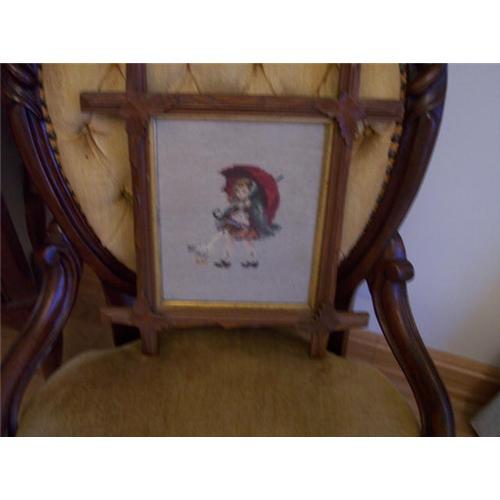 This is a wonderful frame in great condition.Inside needlepoint piece is of a little girl with umbrella by a duck or goose.I do not know the age of the needlepoint piece,it was in the frame when I purchased it.Probably not as old as the frame I would say.Frame measures 12 1/4x10 1/4 not including the crossed pieces on ends.