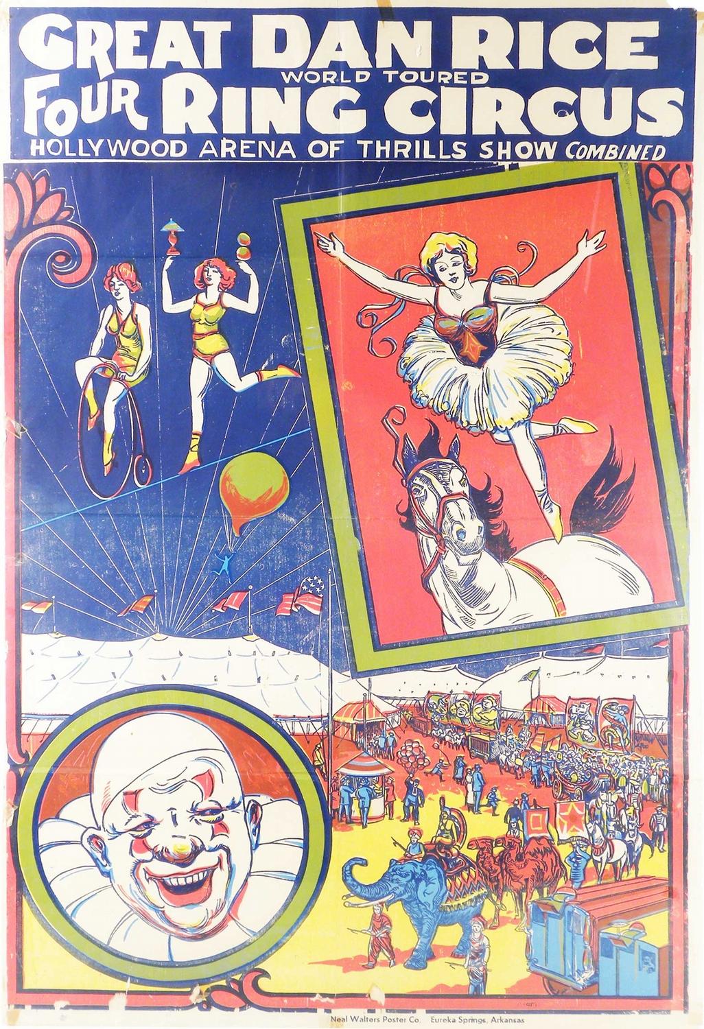 Great Dan Rice "World Toured" 4 Ring Circus Poster. Neal Walters Poster Co. Eureka Springs, AR. Paper loss, tape residue, wrinkles and folds otherwise good condition. 27 X 41 1/2 inches.