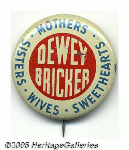 <B>Great Dealer's Lot of "Better" Political Pinback Buttons</B></I> Nine pieces (see our web site for complete images). The "My Ambassador Kennedy" is a 1940 Willkie item, anti-Joe Kennedy, Sr., who was Ambassador to Great Britain. Very scarce Dewey - Bricker variety Texas for Roosevelt - Truman, ( 2) FDR - Wallace jugates, 1924 Davis picture pin, classic McKinley - Roosevelt "Full Dinner Bucket," great Landon slogan, and Taft coat-tail jugate. All excellent shape except Davis is somewhat off-center. Total retail value around $600-$650. Lot:263