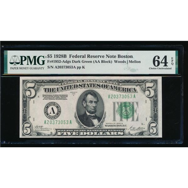 One 1928B $5 Boston FRN PMG 64EPQ.