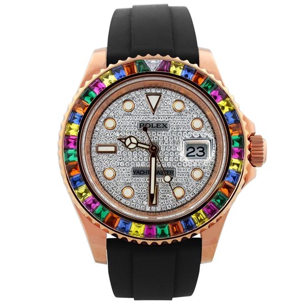 Model: Yacht-Master. Reference #: 116655. Case: 18K Rose Gold. Case Size: 40mm. Bracelet: Rubber Rolex Oysterflex Strap. Dial: