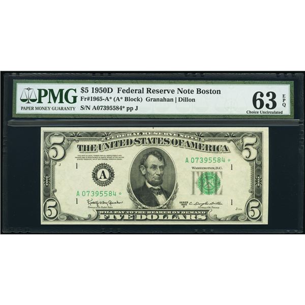 One 1950D $5 STAR Boston FRN PMG 63EPQ.