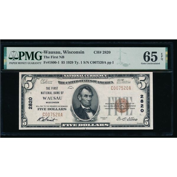 1929 $5 Wausau WI National PMG 65EPQ6 - 1929 $5 Wausau WI National PMG 65EPQ