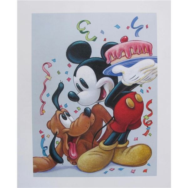 Mickey and Pluto Birthday Cake Lithograph. This is the same image as a 2004 U.S. postage stamp. Paper measures: 14 inches x 11 inches. Image measures