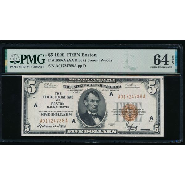 1929 $5 Boston FRBN PMG 64EPQ215 - 1929 $5 Boston FRBN PMG 64EPQ