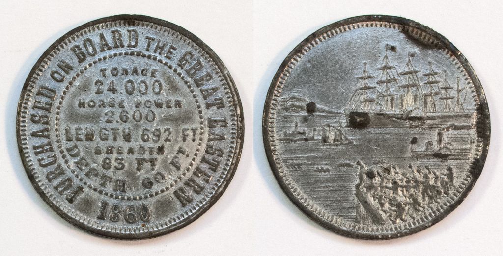 Obv.: Purchased on Board Great Eastern / 1860 / Tonage / 24000 / Horse Power / 2600 / Length 692 ft. / Breadth / 83 ft / Depth 60 ft; rev. : pictorial of ships. 32mm, white metal.