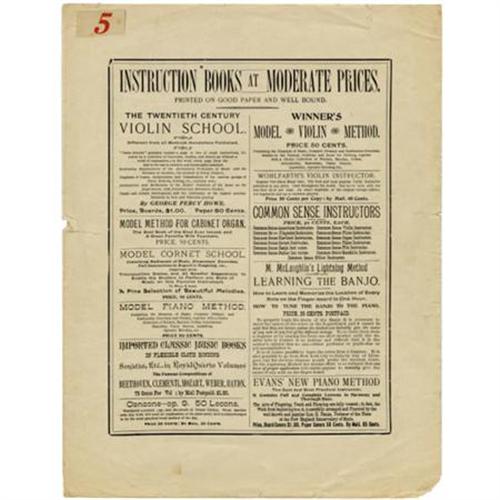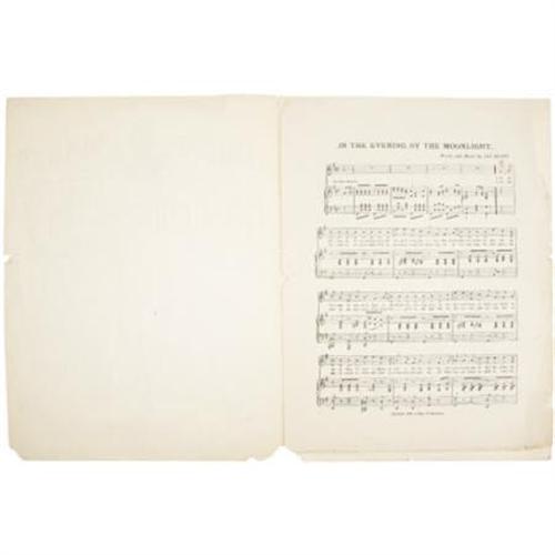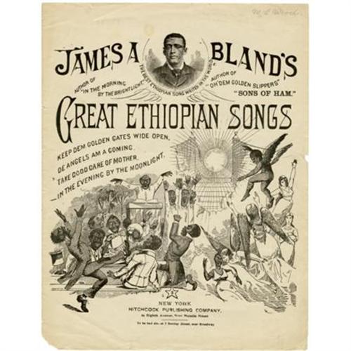<B>Great Ethiopian Songs Sheet Music by Black Writer</B></I> Exceptionally graphic with a rich scene of a church meeting and angels who appear in typical period illustrations of African Americans. This piece, written by James A. Bland, a noted Black songwriter of the period, is titled "In the Evening by the Moonlight". Bland, a Howard University graduate, wrote 700 titles in his lifetime and was most famous for "Carry Me Back to Old Virginny", which became the Virginia state song after some modification. This piece is complete although ragged on the edges and inside sheet.<BR><BR><b>Shipping:</b> Flat Material, Small (<a target="_blank" href="http://www.heritageauctions.com/common/shipping.php">view shipping information</a>)