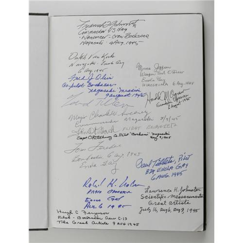<B><I>Great Events of the 20th Century</B></I></B></I> <B>Signed by Edward Teller </B></I> and 13 of those involved (many deceased) with the bombing of Hiroshima and Nagasaki. (New York: Time Books, 1997). The book is signed on the front flyleaf by a total of fourteen people with significant ties to the dropping of the bomb "Fat Man" on Nagasaki in August of 1945. They include: Frederick G. Johnrith, Dutch Van Kirk, Morris Jeppson, Fred J. Olivi, Harold M. Ognew, Edward Teller, Charles W. Sweeney, John D. Kuharek, Capt. C. D. Albury, Tom Ferebee, Paul Tibbets, Lawrence H. Johnston, Hugh C. Ferguson, Richard H. Nelson. All the signatures are clear and dark, some in blue marker, blue ink, or black ink, along with some inscriptions underneath the signatures with ranks and missions. A significant collection. Fine condition.