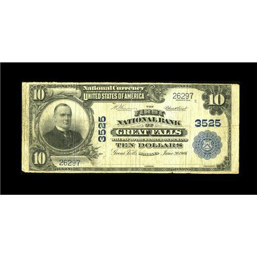 <B>Great Falls, MT</B></I> - $10 1902 Plain Back Fr. 626 <B>The First NB</B></I> Ch. # 3525<BR>Western states just never seem to have an ample supply of notes available to satisfy the growing demands of an influx of National collectors. Tonight's offering is a solid <B>Fine</B></I> likely to sell for upwards of...