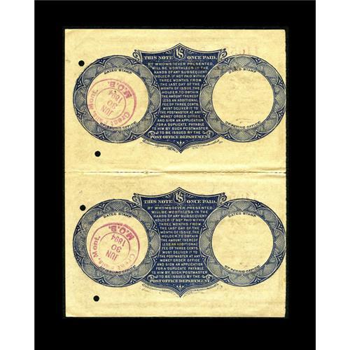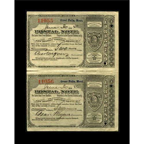 <B>Great Falls, MT- Postal Note Uncut Pair</B></I> $2 June 30, 1894<BR> A fabulous new discovery from an excessively rare state for Postal Notes of any kind, much less an uncut pair. This pair represents the only Postal Notes of any kind we have ever handled from Montana, and one of only a handful of Postal Note pairs known from any location. <B>Extremely Fine-About Uncirculated, </B></I>with a fold between the notes. <BR><BR><b>Shipping:</b> Coins & Currency (<a target="_blank" href="http://www.heritageauctions.com/common/shipping.php">view shipping information</a>)