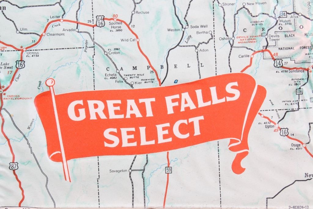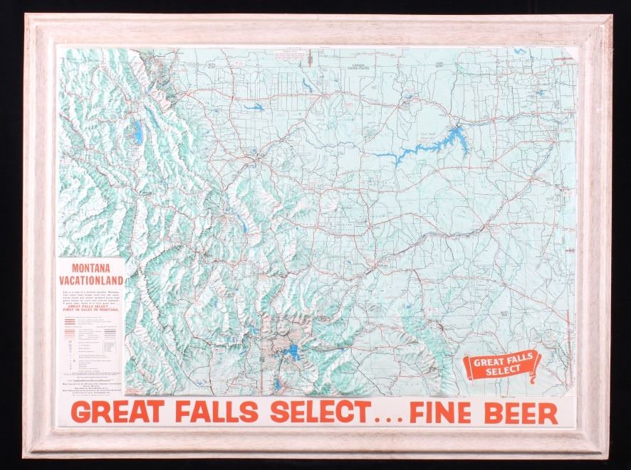 This is a Great Falls Select Beer topographic  map of Montana. The piece displays a colored map of Montana with a legend in the lower left corner. The map is highly detailed  with three dimensional features. The Great  Falls Select logo is seen in the lower right  corner with the bottom marked "Great Falls Select... Fine Beer". The map is not dated, but is believed to be from the 1960's. The Great Falls Select map is in good condition. The map measures 30" wide by 23" tall.