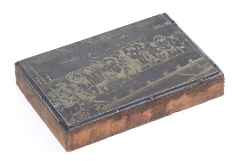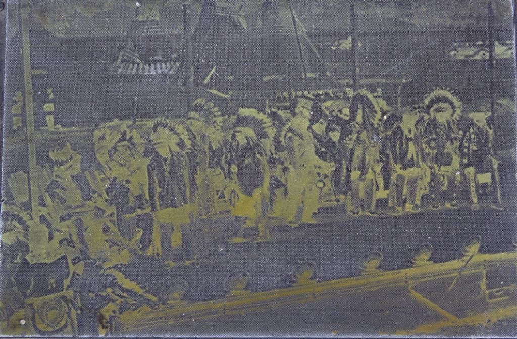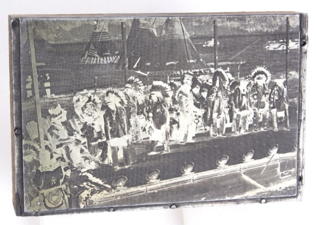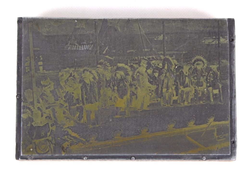 This is an original Great Falls Tribune, Montana paper printing block showing a Native American group of Chiefs. Age is unknown. Measures 3.5"x5.25" and 7/8" thick.