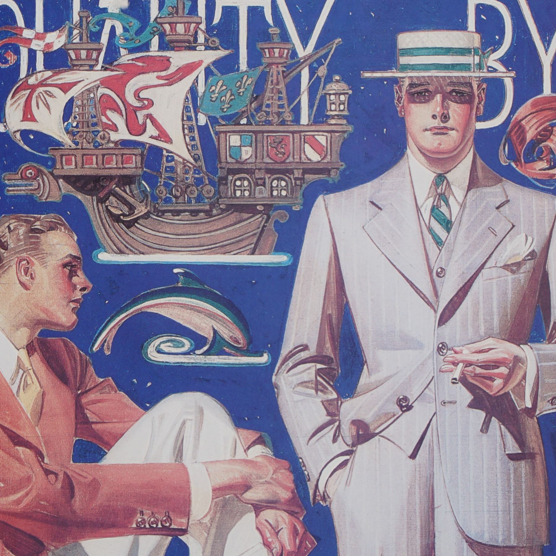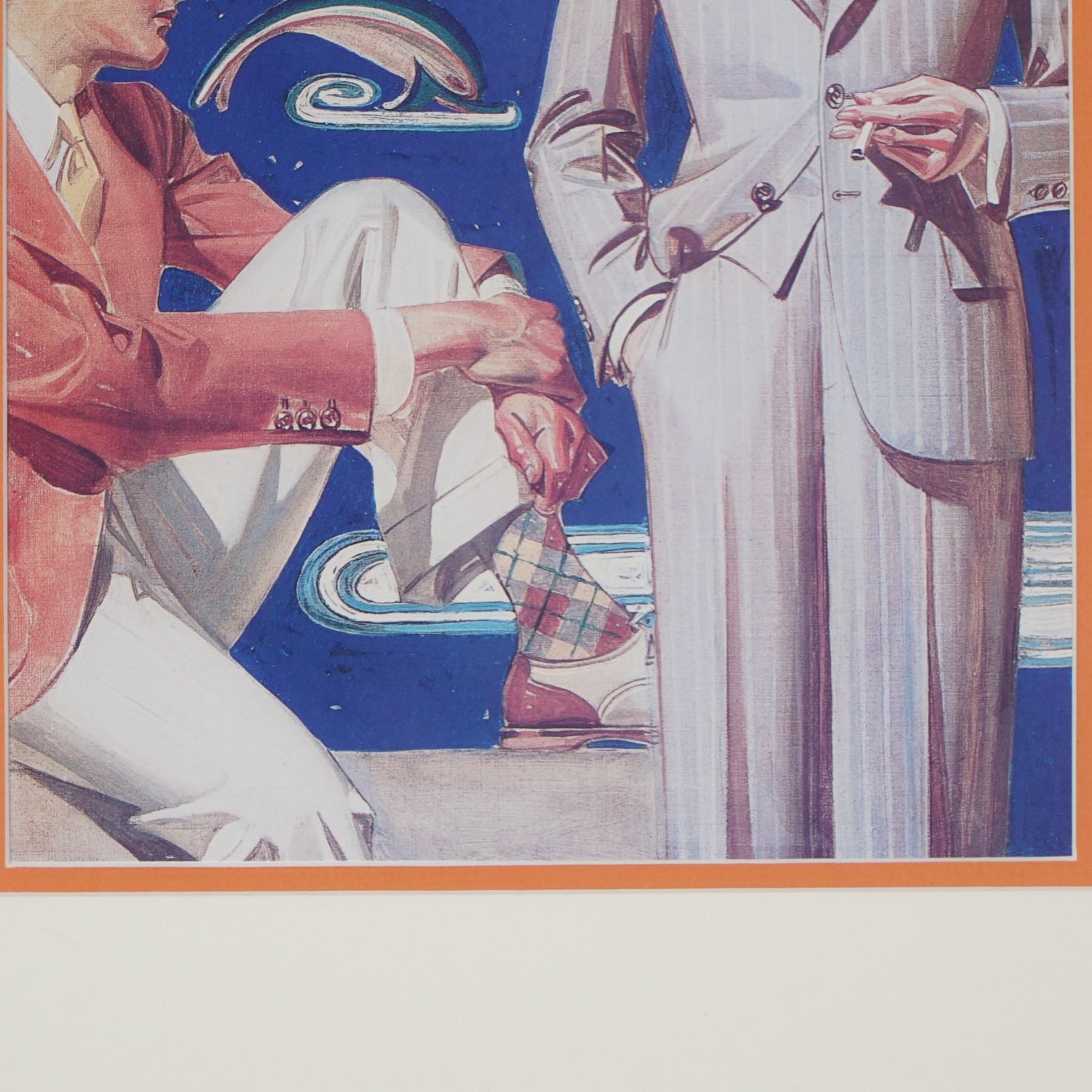 Striking Art Deco-style print inspired by The Great Gatsby, featuring two sharply dressed men in vintage attire against a vivid blue background. Nautical elements like a galleon ship and swirling waves enhance the 1920s fantasy aesthetic. The standing figure in a pinstriped suit and boater hat captures the elegance and sophistication of the Jazz Age. Housed in a silver and gold-toned frame with a double mat in coordinating tones.
