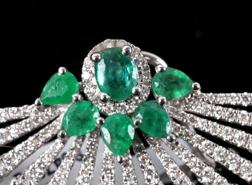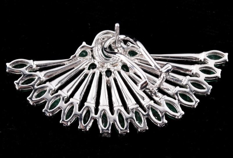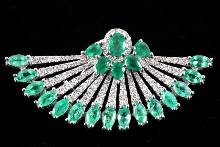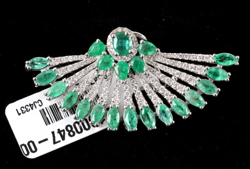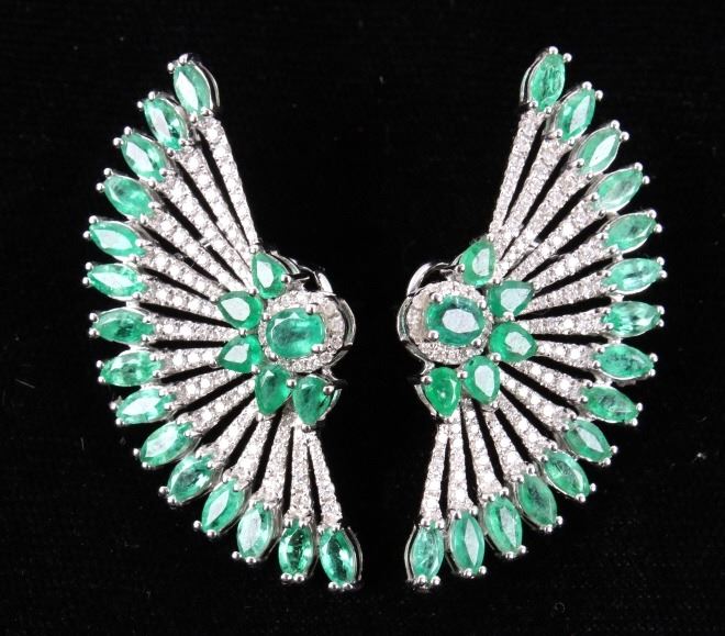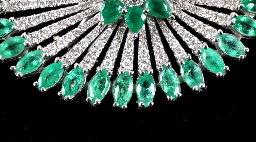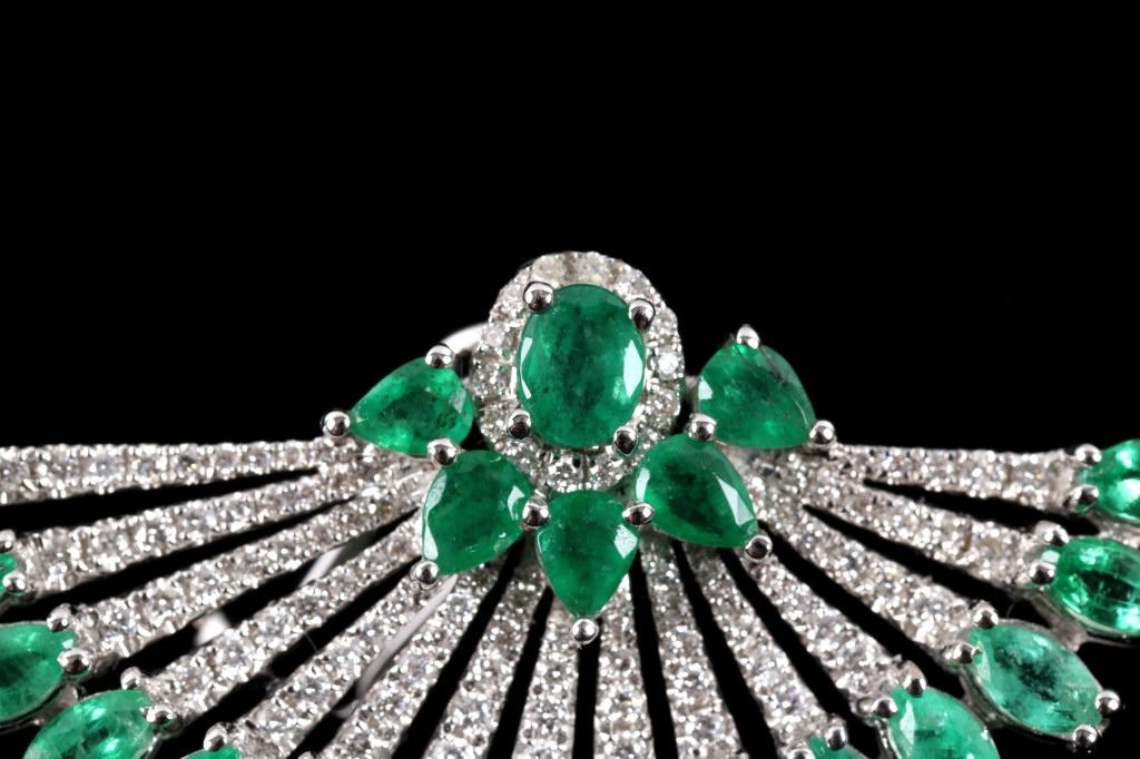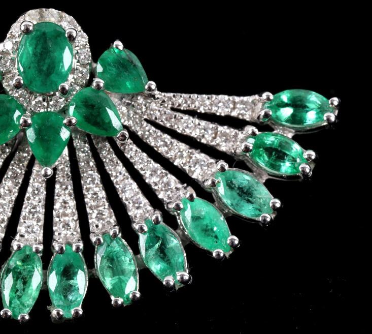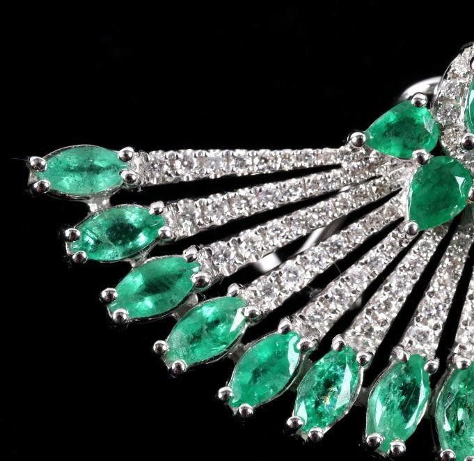 Possibly the most unique and gorgeous piece of jewelry in the sale is this set of 18K earrings set with natural Emerald and Diamonds in a fanning peacock feather Great Gatsby design. These brand-new earrings have a fanning design in 18 karat white gold being set with a total of 42 natural Emeralds with weight of 6.12 carats with vivid green coloring. The set is further accented by the 204 round brilliant cut Diamonds having a total weight of 1.14 carats truly giving the set a glimmer and brilliance that sets them apart. The set will truly be a showstopper any time you wear them channeling your inner Great Gatsby 1920’s glamour. Total weight of 16.25 grams.