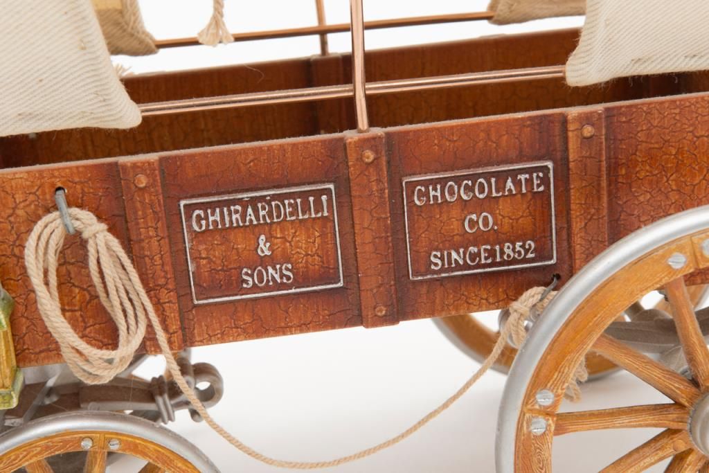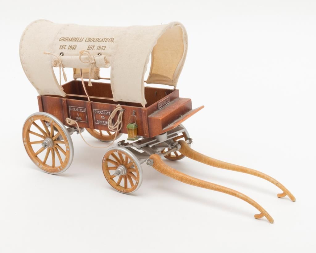 Great Ghirardelli Chocolate Co. advertiser in form of a covered wagon approx. 21” long including horse rails, 11” in height and 7” wide; a neat display piece! Est.: $75-$150.