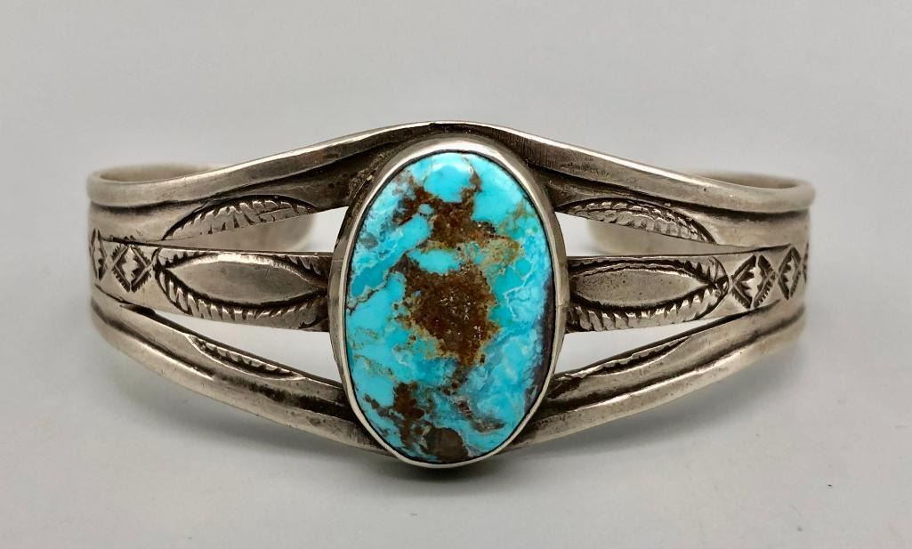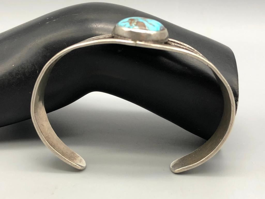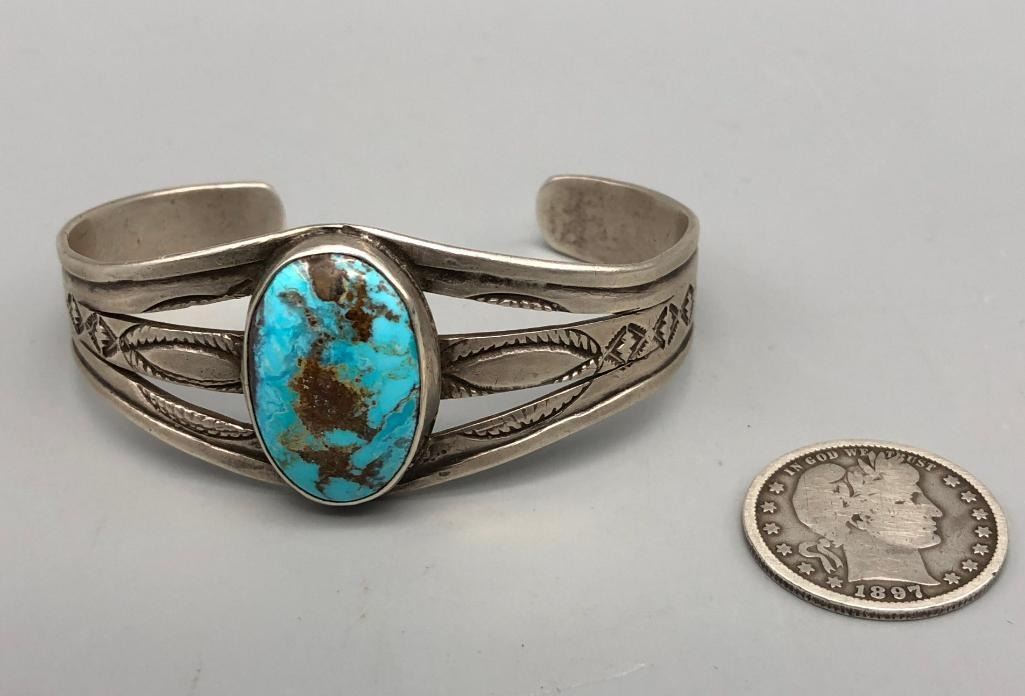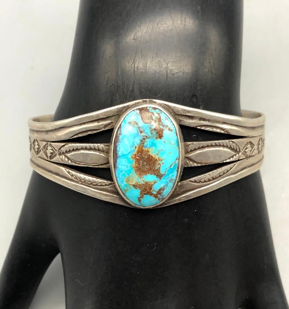 For sale in this lot is a great ingot turquoise bracelet. This is a beautiful older bracelet set with a stunning turquoise stone that has a bold matrix running through the middle. It is set in a smooth bezel, mounted on a split shank. MAKER: Unmarked. APPROX AGE: Circa 1970s. SIZE: Inside circumference measures 5-5/8 inches long. Opening is an additional 1-1/8 inches, fitting a 6-3/4 inch wrist. Width is 1-1/8 inches. Weighs 33.6 grams. CONDITION: Good for its age, normal wear expected. Please look closely at the pictures as they are an important part of our description and are hereby incorporated into the description, specifically with regards to condition. SHIPPING: There will be a $5 handling / packaging fee for shipping this lot. The actual cost of postage will be added on top of that. BUY IT NOW: If you would like to buy this item now, without waiting for the auction day to bid on it, we do offer this option (which is available up to 48 hours before the actual auction starts). The “Buy it Now†price is the high estimate of this lot (plus applicable fees and the Buyer's premium is discounted to 10% when using the Buy it Now option). If you would like to exercise this option, you must contact us by email (or phone as long as you talk to someone live). Reference this lot number and your intention to "Buy it Now."