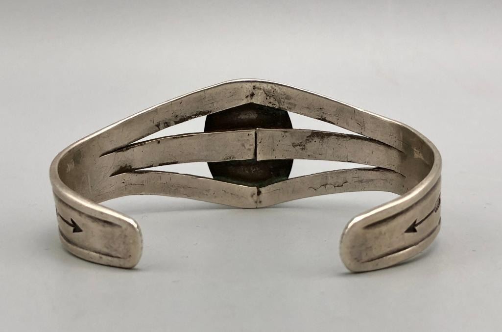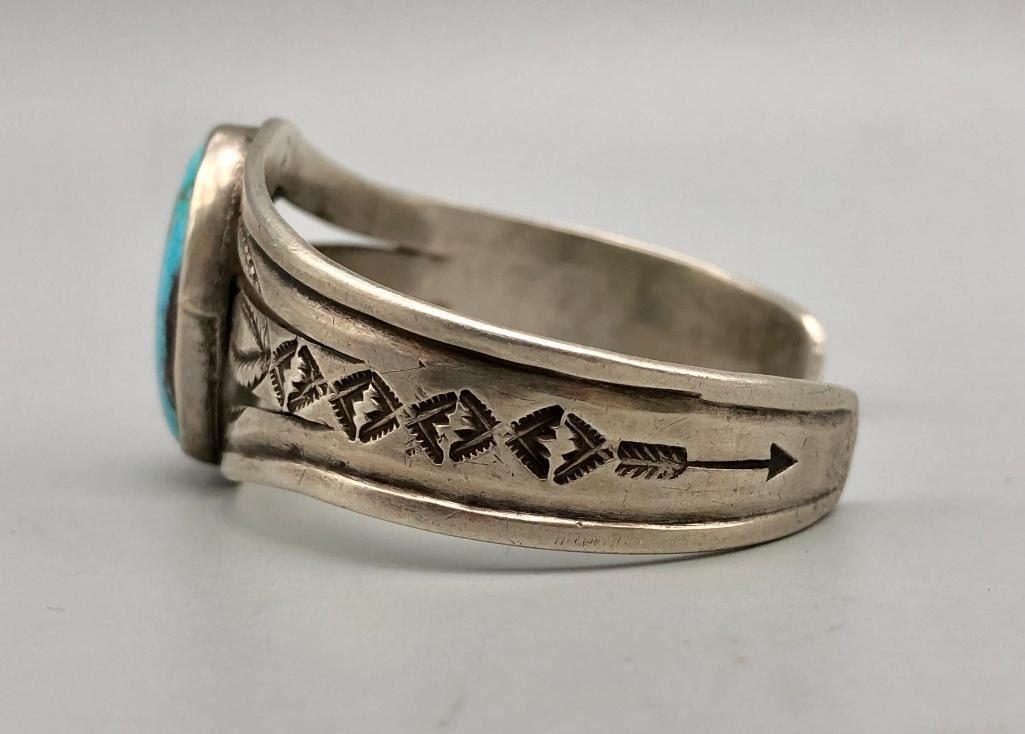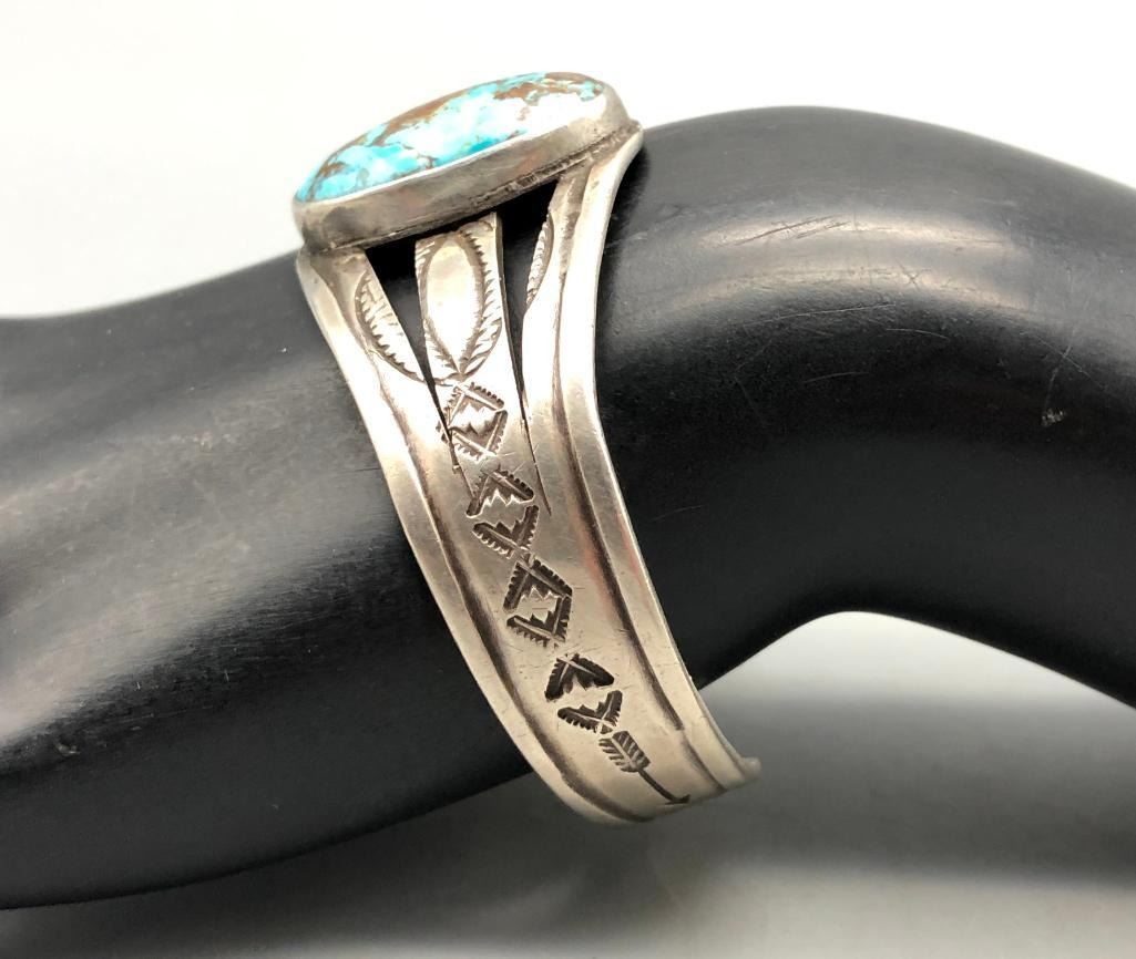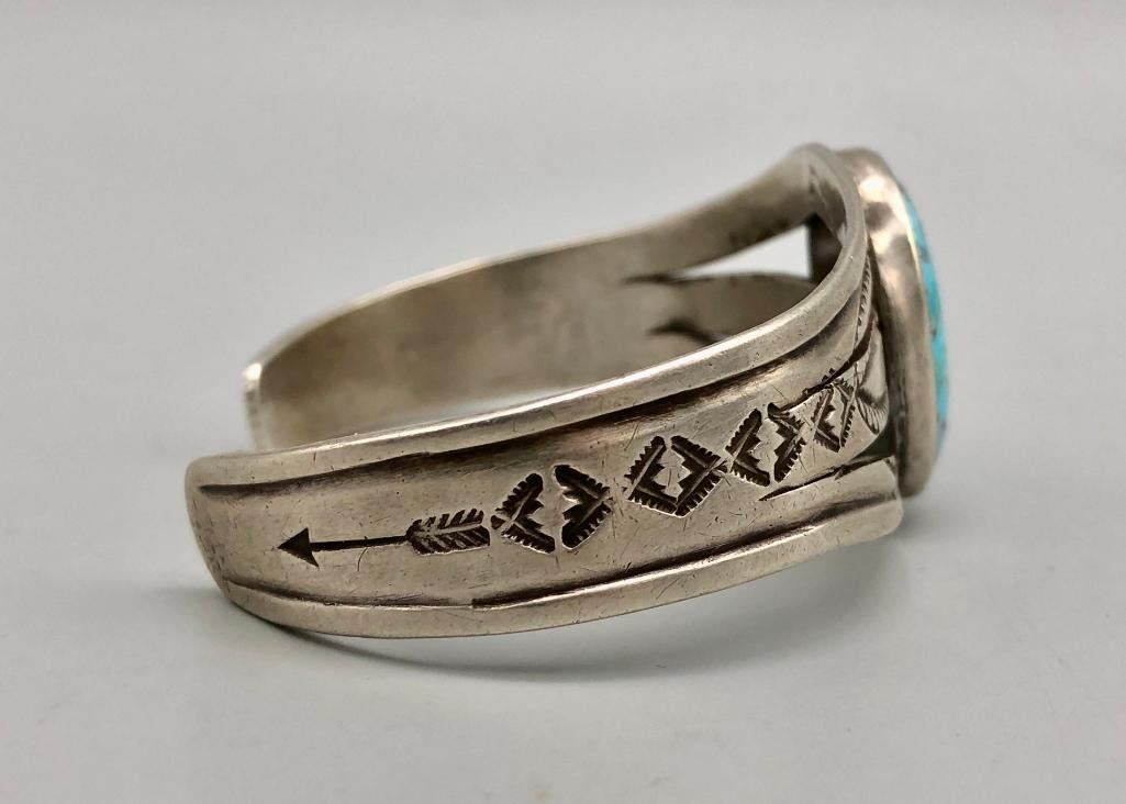 For sale in this lot is a great ingot turquoise bracelet. This is a beautiful older bracelet set with a stunning turquoise stone that has a bold matrix running through the middle. It is set in a smooth bezel, mounted on a split shank. MAKER: Unmarked. APPROX AGE: Circa 1970s. SIZE: Inside circumference measures 5-5/8 inches long. Opening is an additional 1-1/8 inches, fitting a 6-3/4 inch wrist. Width is 1-1/8 inches. Weighs 33.6 grams. CONDITION: Good for its age, normal wear expected. Please look closely at the pictures as they are an important part of our description and are hereby incorporated into the description, specifically with regards to condition. SHIPPING: There will be a $5 handling / packaging fee for shipping this lot. The actual cost of postage will be added on top of that. BUY IT NOW: If you would like to buy this item now, without waiting for the auction day to bid on it, we do offer this option (which is available up to 48 hours before the actual auction starts). The “Buy it Now†price is the high estimate of this lot (plus applicable fees and the Buyer's premium is discounted to 10% when using the Buy it Now option). If you would like to exercise this option, you must contact us by email (or phone as long as you talk to someone live). Reference this lot number and your intention to "Buy it Now."