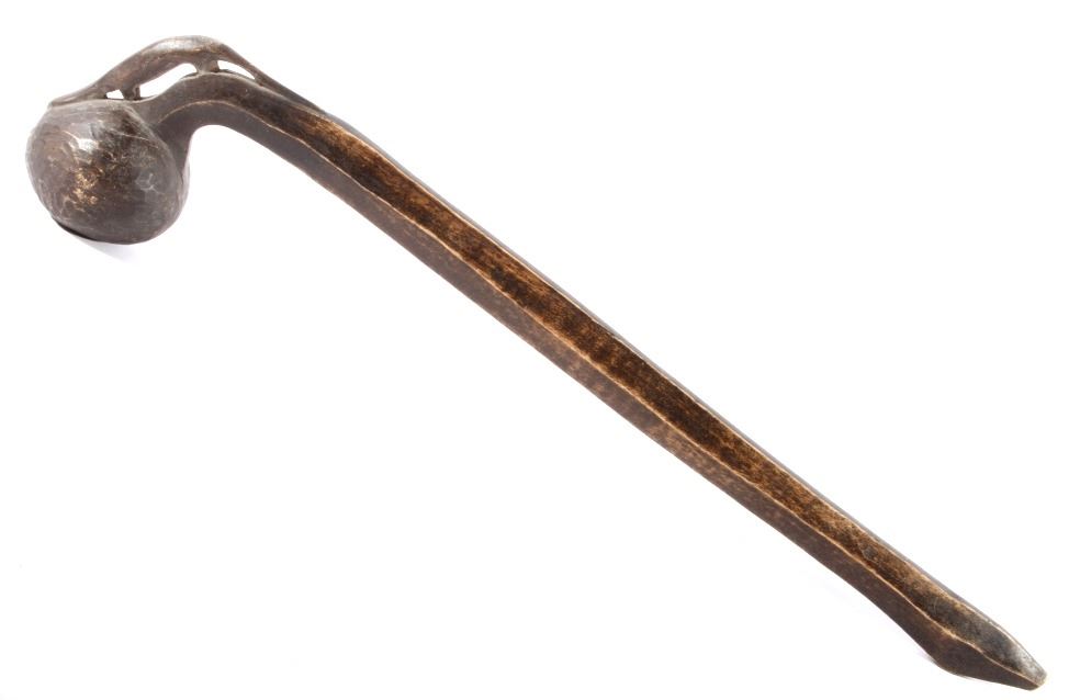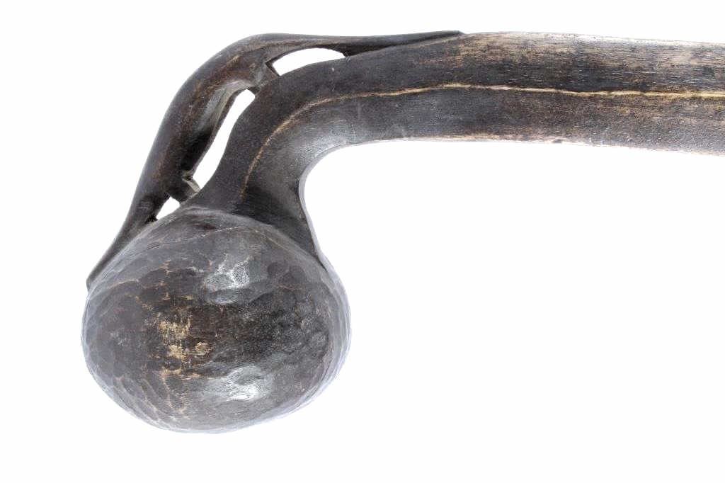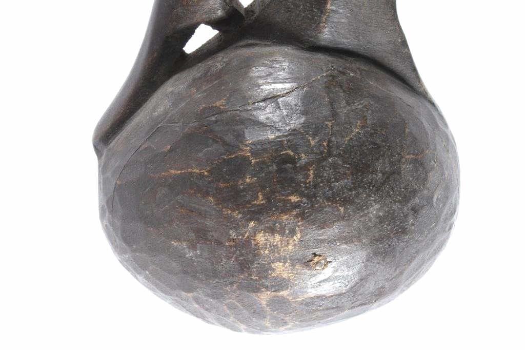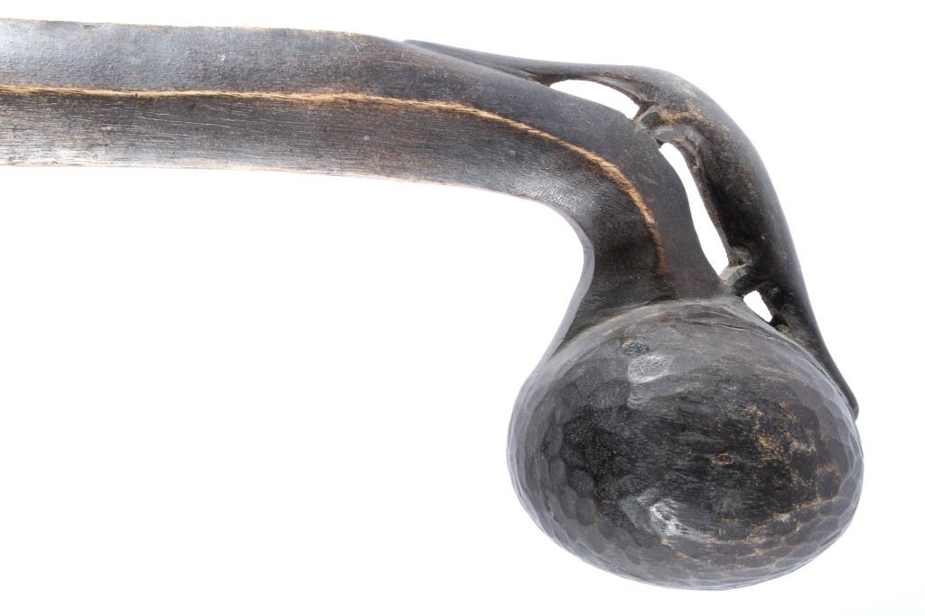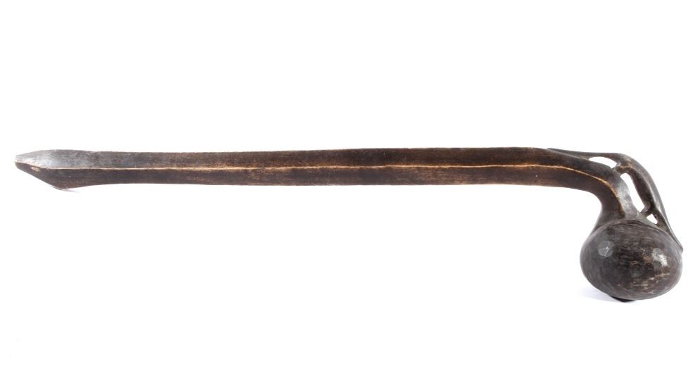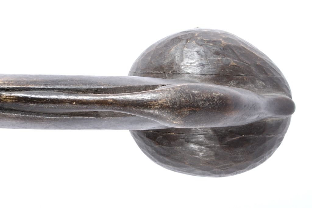 This is a Great Lakes Native American Indian carved Ball Head War Club from the 19th Century. The piece shows a Ball Head with six sided curved haft having a Otter effigy carved on the top curve. The handle is in an excellent shape design and presents very well. Provenance: The piece is from a large Native American Indian artifact private collection in Saskatchewan, Canada and was collected in Ontario, Canada from a large Indian collection. The piece is in very well preserved museum quality condition. Measures overall 27.5"L with a 3 5/8"x4"x3.5" ball head.
