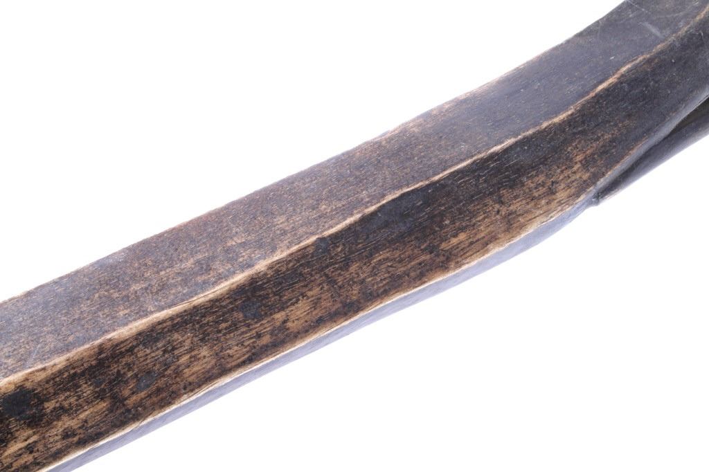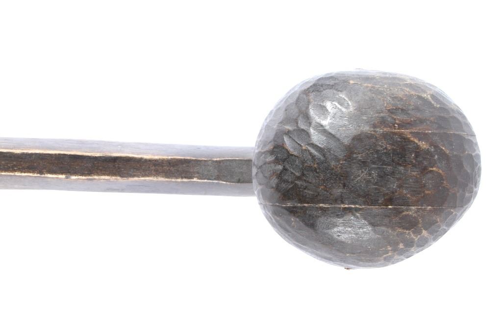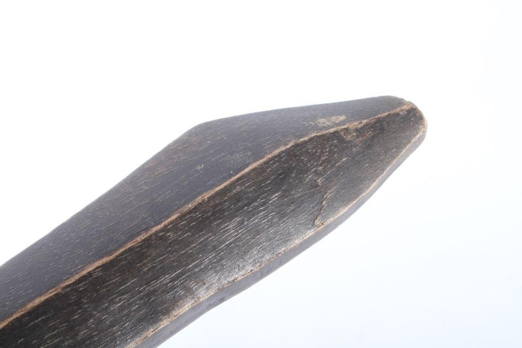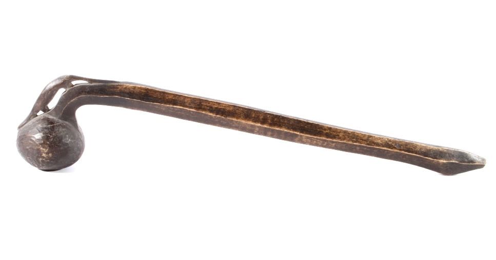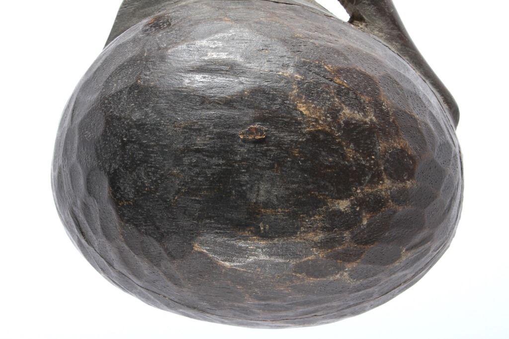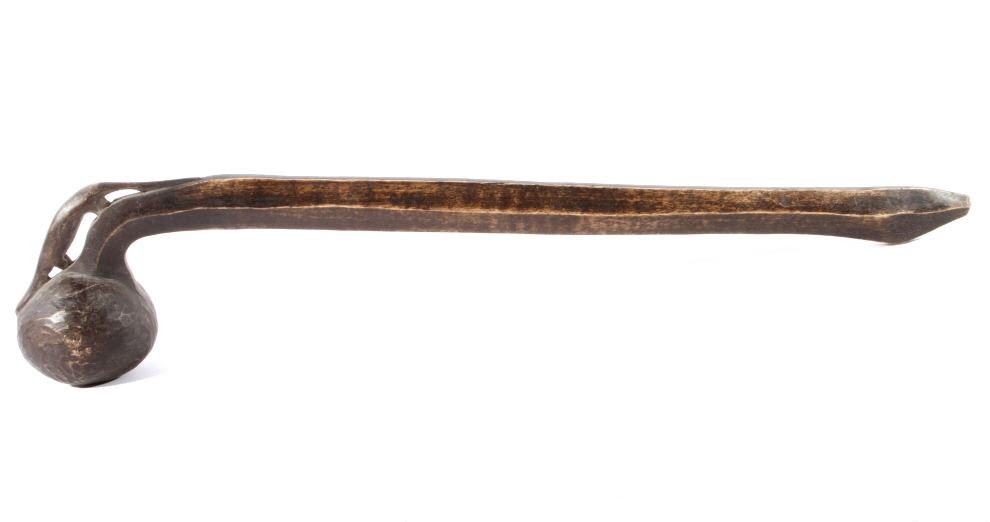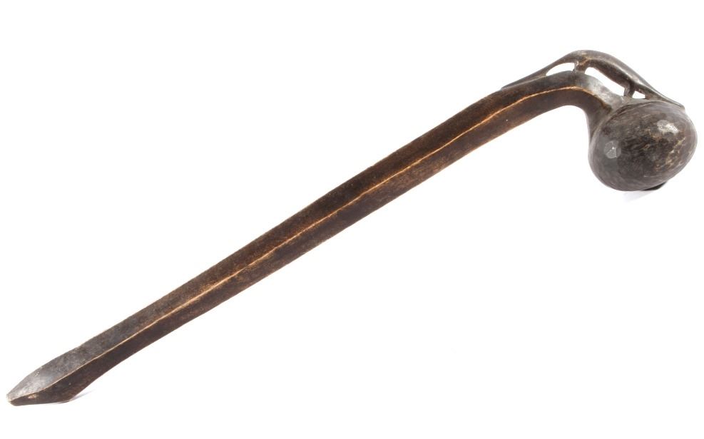 This is a Great Lakes Native American Indian carved Ball Head War Club from the 19th Century. The piece shows a Ball Head with six sided curved haft having a Otter effigy carved on the top curve. The handle is in an excellent shape design and presents very well. Provenance: The piece is from a large Native American Indian artifact private collection in Saskatchewan, Canada and was collected in Ontario, Canada from a large Indian collection. The piece is in very well preserved museum quality condition. Measures overall 27.5"L with a 3 5/8"x4"x3.5" ball head.