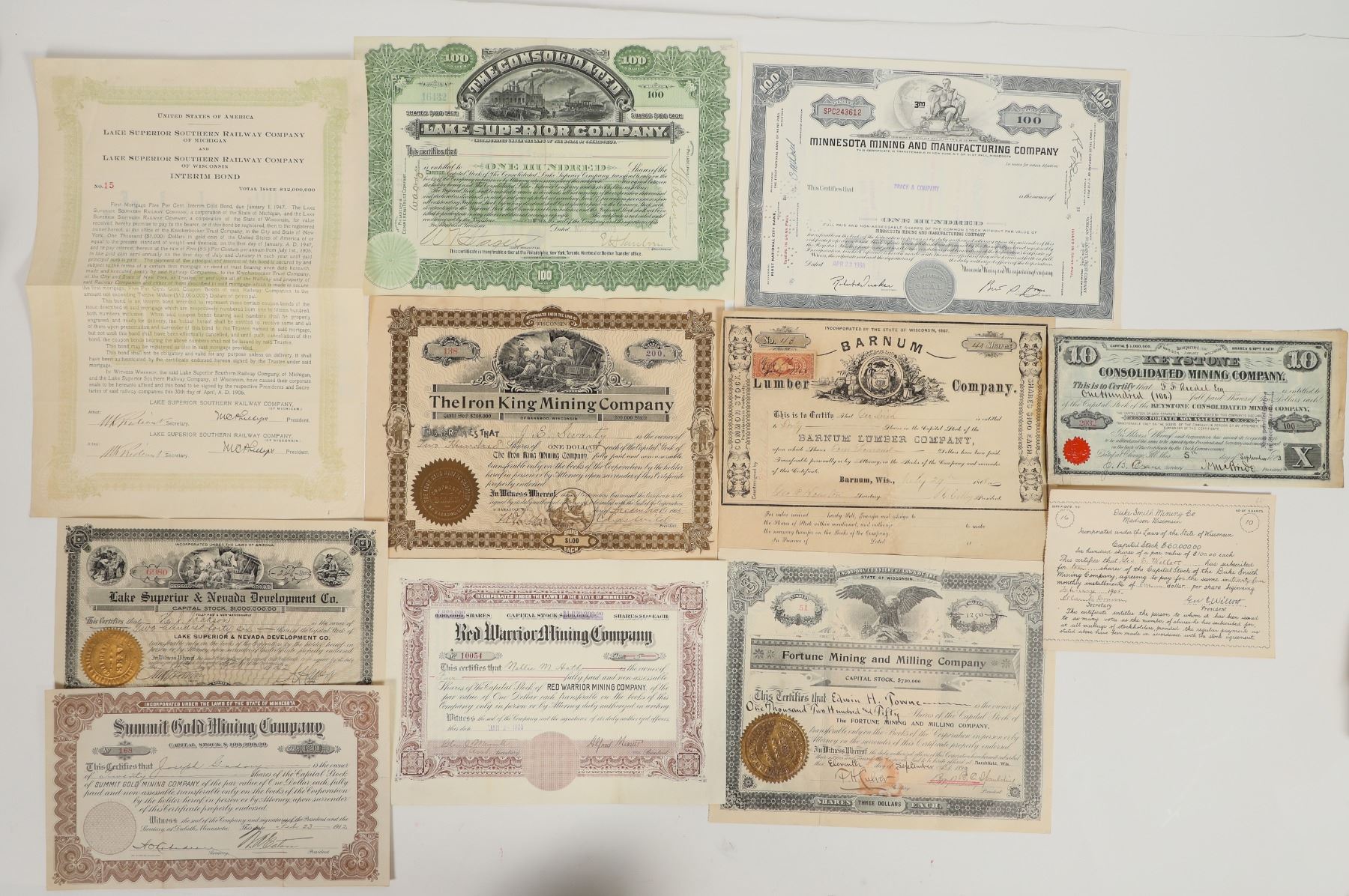 Lot of 11 different. Copper, iron, lumber, etc. Issued 1868-1968 (spans 100 years). Includes: Barnum Lumber Co. (1868); Keystone Cons. MC (1883); Iron King MC (1903); Lake Superior & Nevada Develop. Co. (1912); and more. Please see photo.