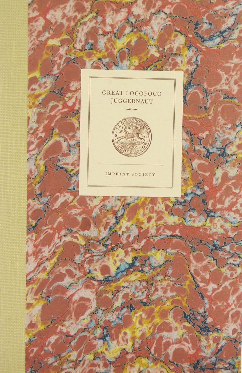 Johnson, Malcolm. GREAT LOCOFOCO JUGGERNAUT, A NEW CONSOLE-A-TORY SUB-TREASURY RAG-MONSTER: A CARTOON BANK NOTE BY D.C. JOHNSTON. Barre: Imprint Society, 1971. Small 4to, original tan cloth and marbled boards; illustrated title label on front board as issued. 35, (3) pages; engraved plate laid in. Near fine. One of 1950 copies, this one unnumbered. A fine production examining a satirical banknote issued during the Hard Times of the 1830s. The engraved plate is of the banknote discussed, printed from the original copperplate in the collection of the AAS.
