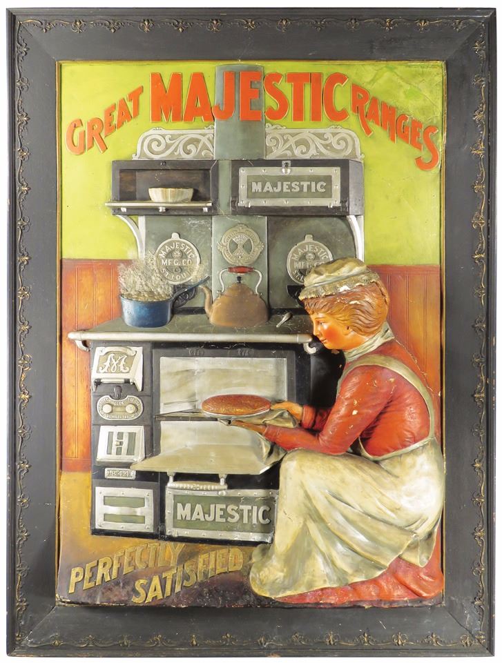 Great Majestic Ranges Dimentional Sign in original frame. Majestic Mfg. Co. St. Louis, Mo. Stunning color and graphics. Restoration at top right and slight rubs at high relief otherwise good condition. 37 X 48 3/4 inches overall.