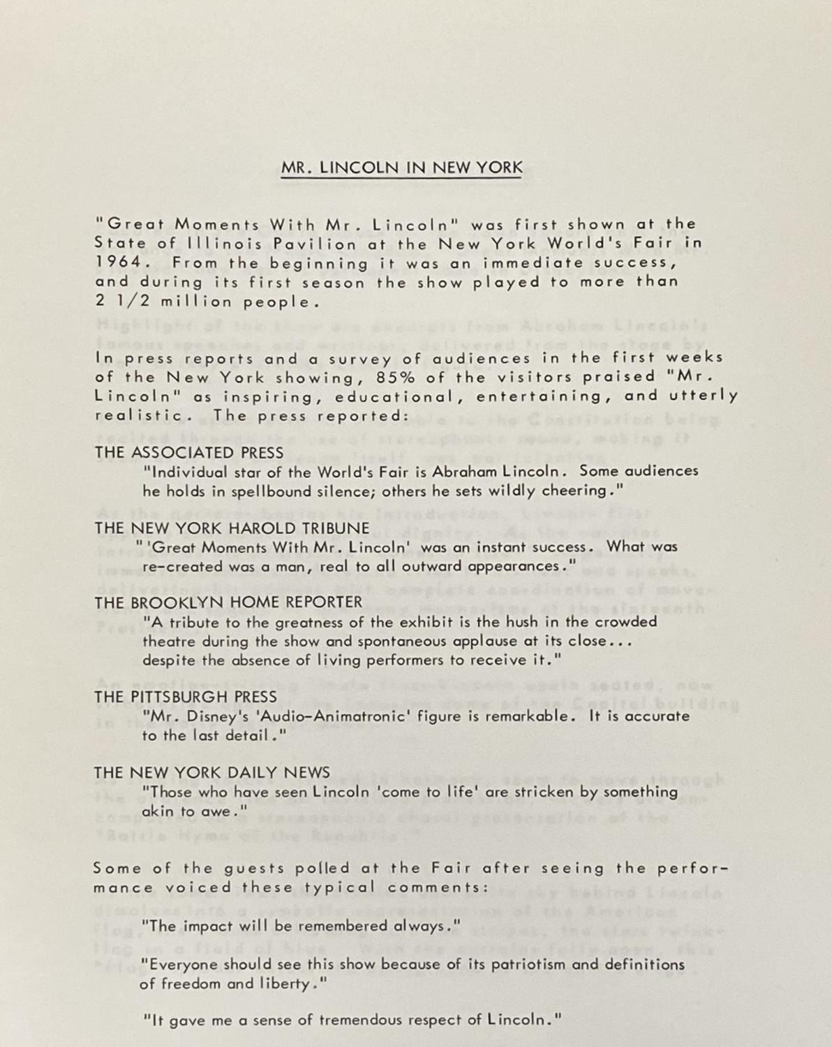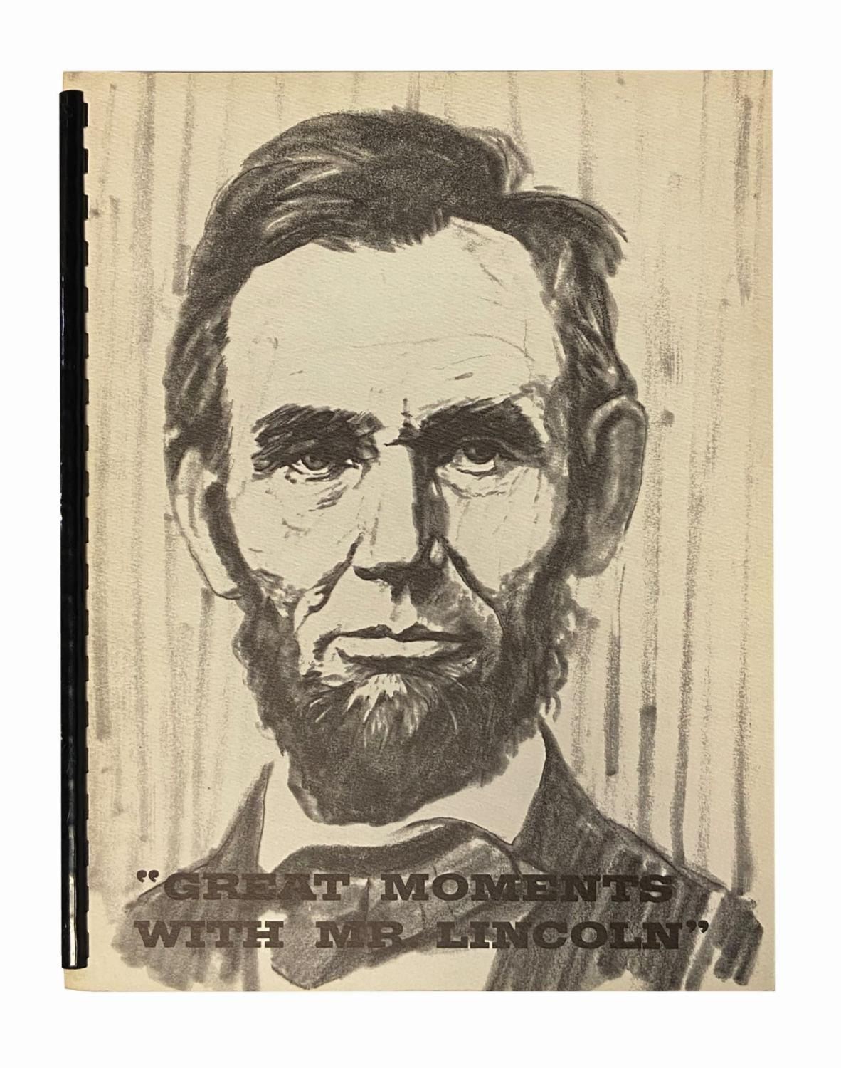 (Disneyland, 1965) A rare original Great Moments with Mr. Lincoln "premiere season" cast member training manual created by the University of Disneyland. The 22-page spiral-bound booklet features a printed head and shoulders illustration of Lincoln on the cardstock cover. The contents include biographical information on Lincoln; details of Walt's admiration for the 16th president; a synopsis and script of the presentation; information on the theater; specs of the audio-animatronic figure; and duties of the various cast members manning the attraction. Measuring 11.25"x8.75", the manual is in fine condition with light browning to the top edge of the cover and minor corner wear to covers.
