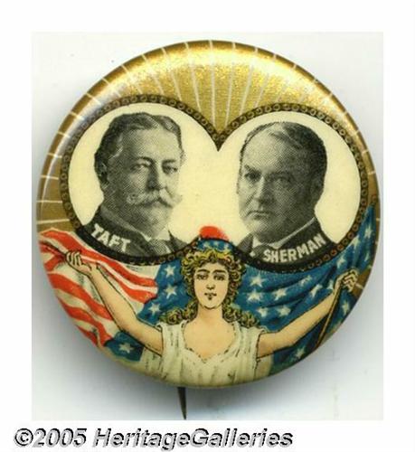 <B>Great Multicolor 1 1/4" Taft and Sherman Jugate Button</B></I> This bold design was introduced in 1904, but is much scarcer for the 1908 and 1912 candidates. The present example could date from either campaign. Choice condition. Lot:261