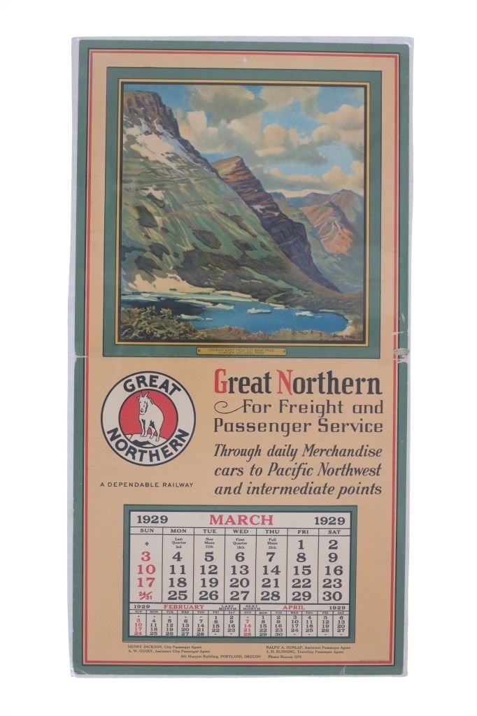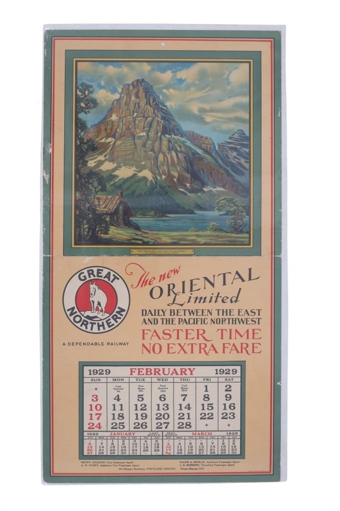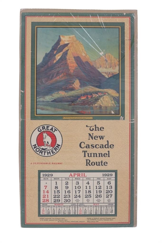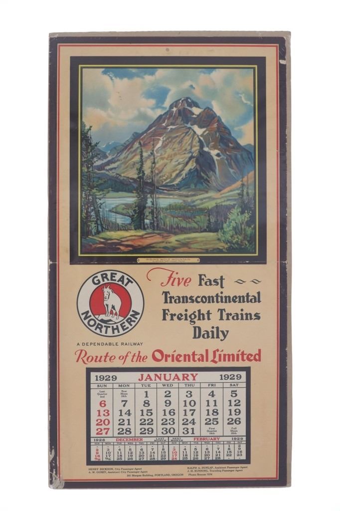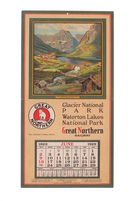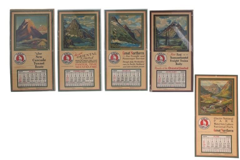 Featured in this lot are five, Great Northern Railway single calendars with artwork done by Adolph Heinze from 1929. Adolph Heinze (1887 – 1958) was born in Chicago, Illinois on February 5, 1887. He was a student of Karl Albert Buehr, Grant, Snell and later, with William Merritt Chase in New York. He was a member of the Painters and Sculptors of Chicago, the Chicago Gallery Association and the All-Illinois Society of Fine Arts. These single calendars were from a full calendar but this lot only features the months of January, February, March, April & June of 1929. The art featured on these calendars are as follows: Rising Wolf Mountain - Glacier National Park, Two Medicine Lake & Mt. Rockwell - Glacier National Park, Looking East From Cut Bank Pass - Glacier National Park, Going To The Sun Mountain & Chalets - Glacier National Park and Many Glacier Hotel at Lake McDermott - Glacier National Park. Each calendar features the "Great Northern" logo with the mountain goat image set in the center. They each feature a different slogan on the right hand side. Four are set on poster board and shrink wrapped to preserve its condition. They show good condition overall with slight wear present from their age and use over the years but no major signs of damage is noted. They measure 20 5/8" L x 10 3/4" W and have a collective weight of