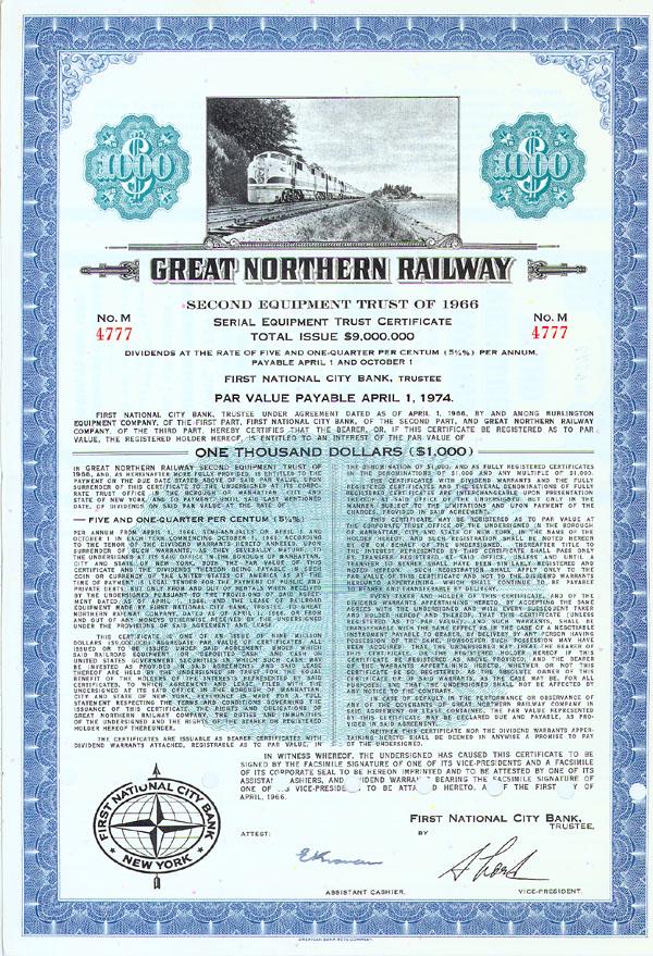 1970's, New York. $1000 Bond bearing 8 1/2% interest. Blue/Black. Vignette of train at top center. Punch cancelled. Very fine.