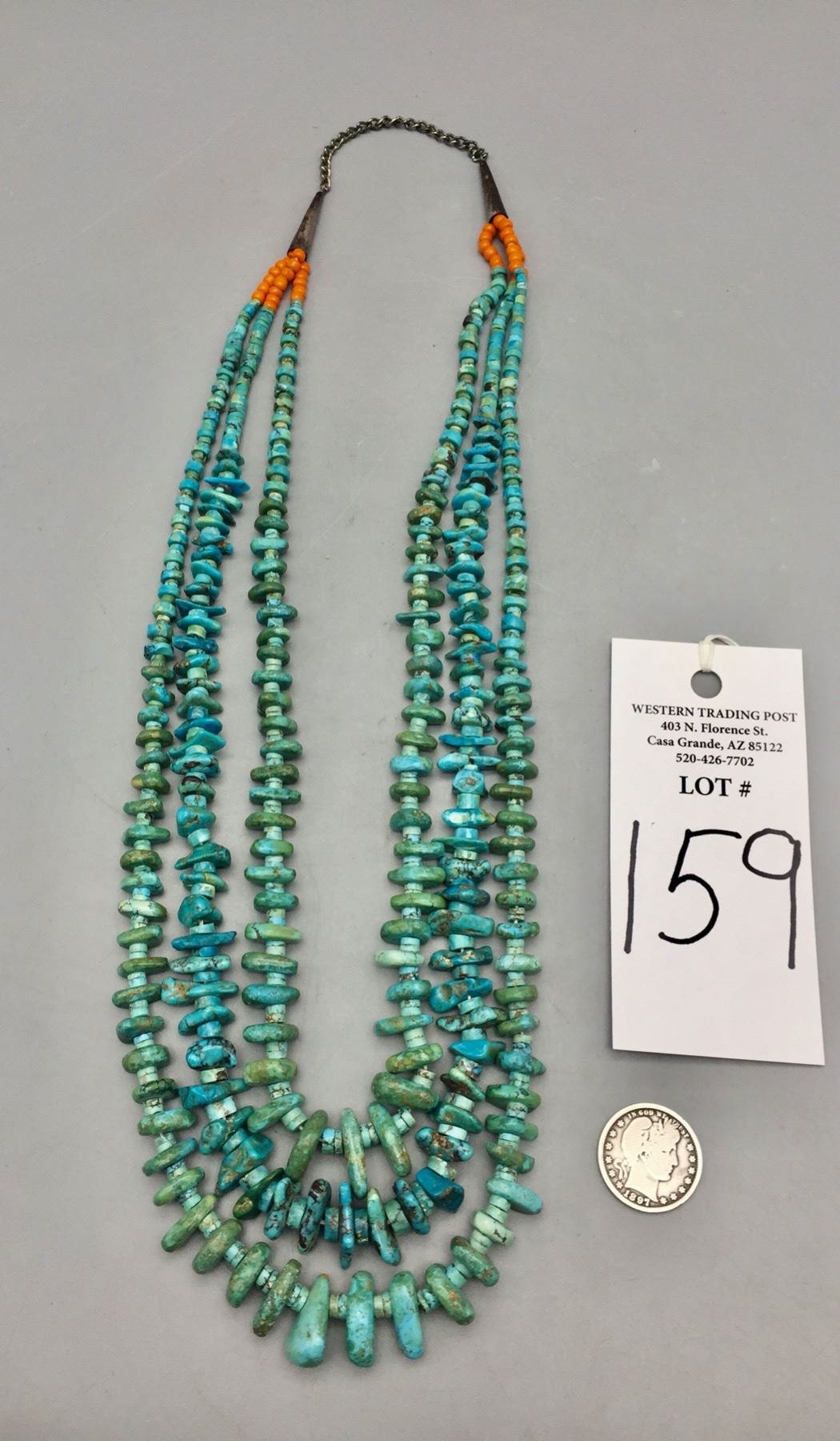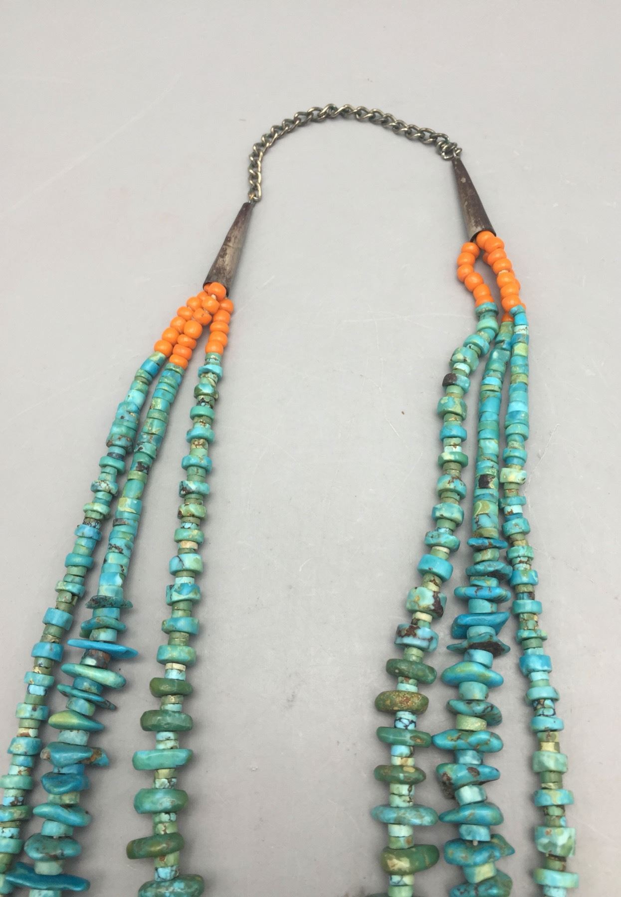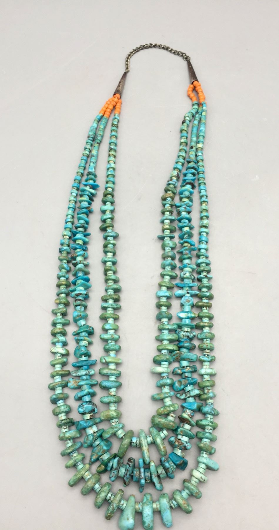 Description: Presented for sale in this lot is a great older three-strand turquoise necklace. It has two different styles HANDMADE turquoise beads and is accented with orange beads and sterling silver findings near the closure are behind the neck. The handmade turquoise beads are changing various shades of blue green due to age. Maker: Unknown. Approx. Age: Circa mid-century. Size: Fits a 25 inch neck. Weighs 178.9 grams. Condition: Good for its age, normal wear expected. Please look closely at the pictures - they are an important part of our description. Shipping: There will be a $5 handling, packaging fee for shipping this lot. The actual cost of postage will be added on top of that.