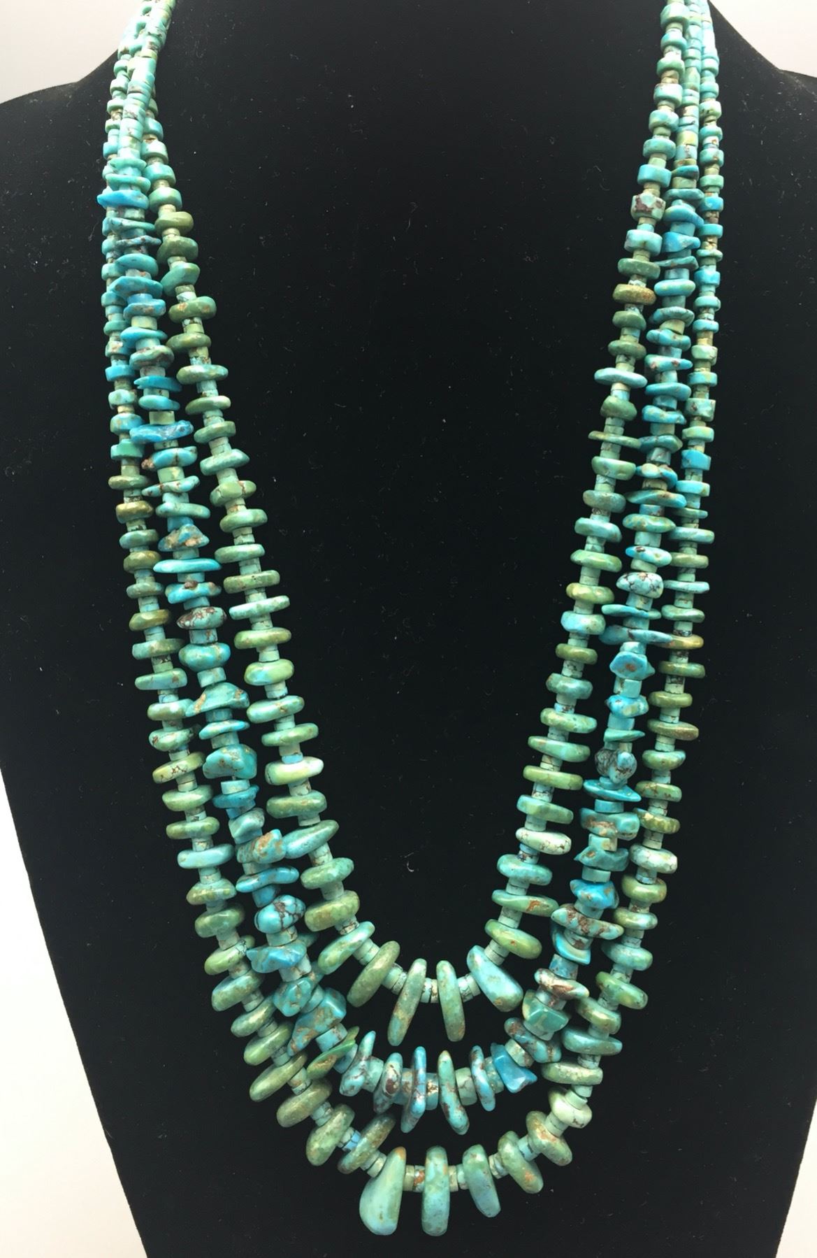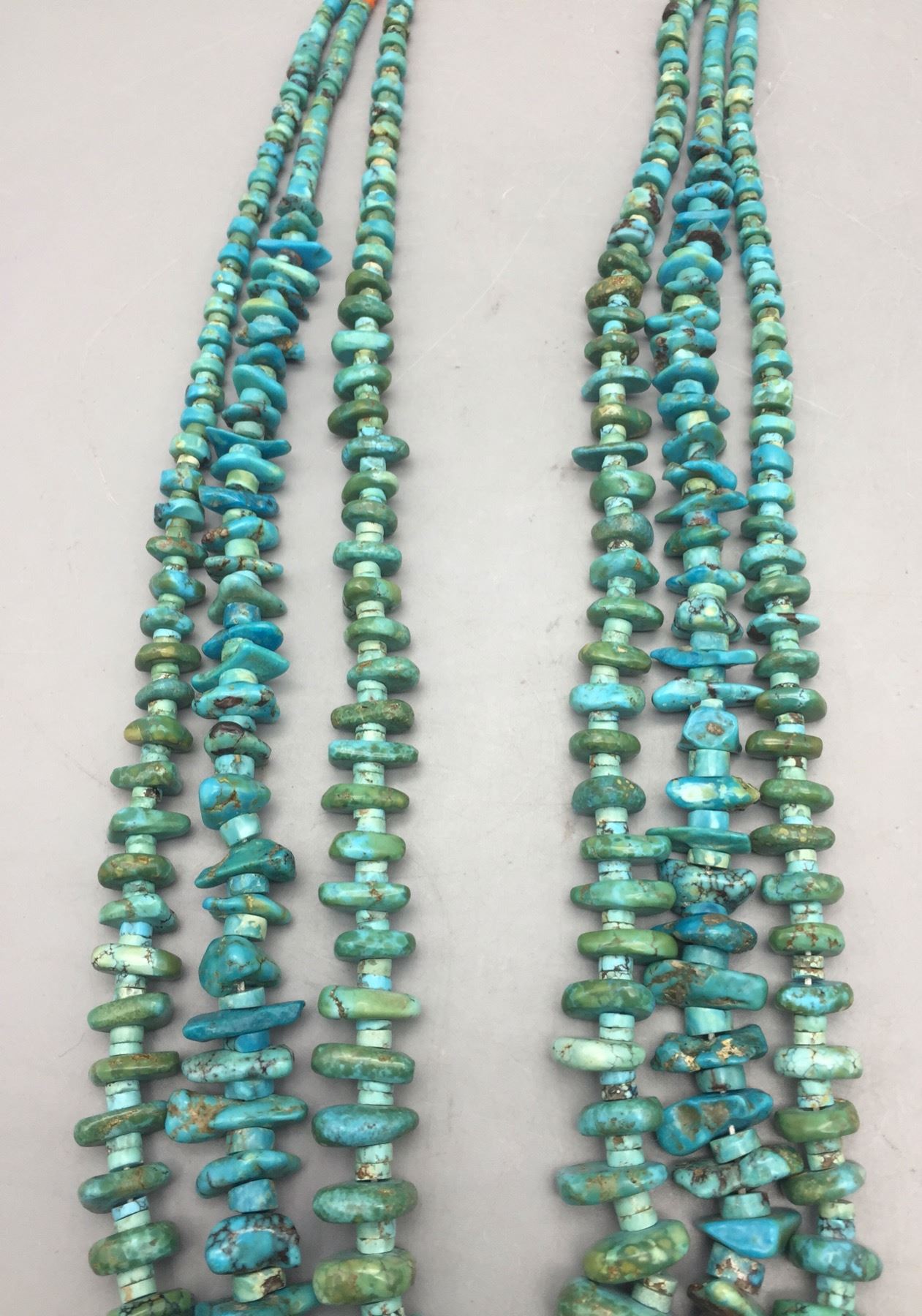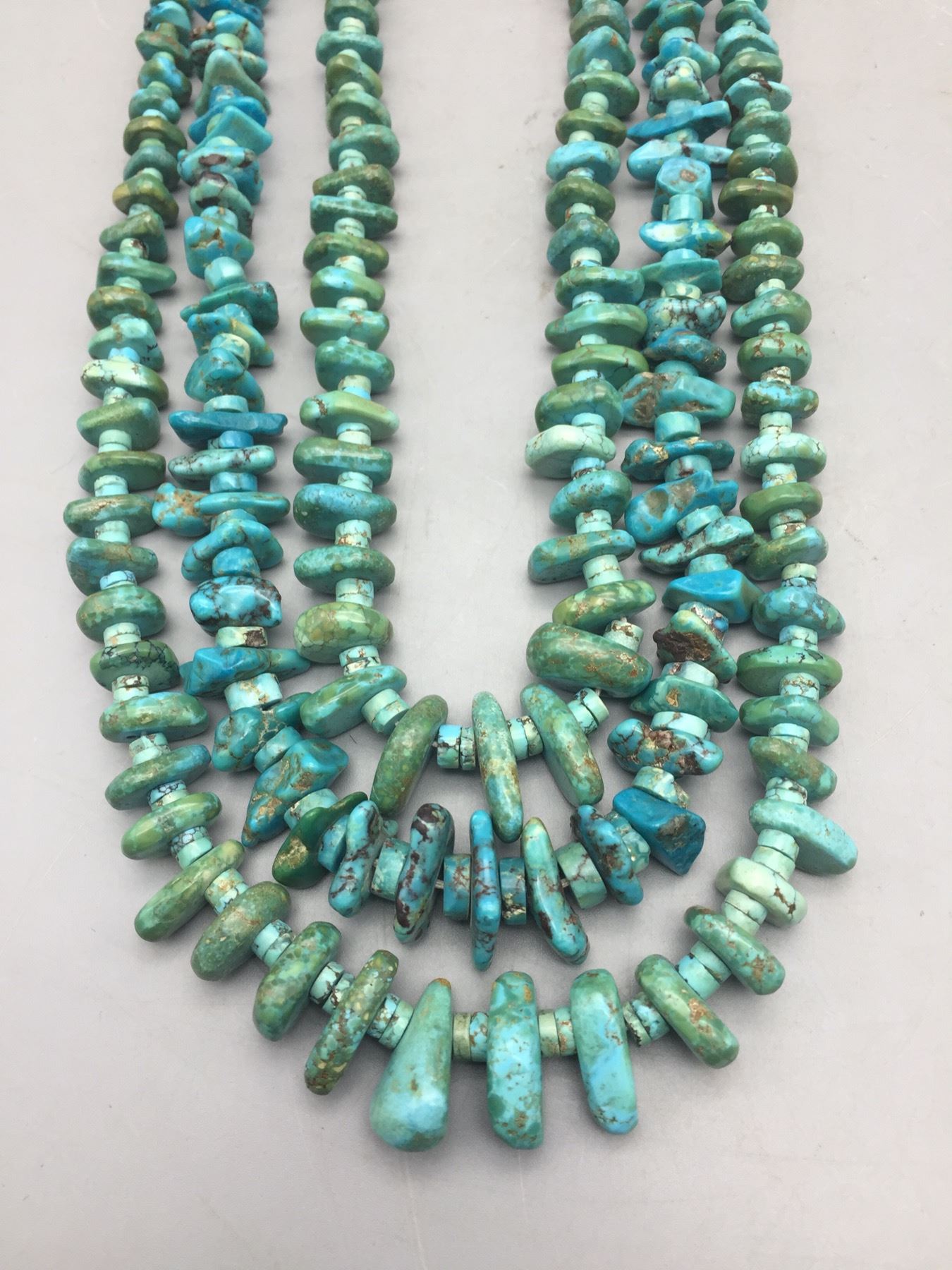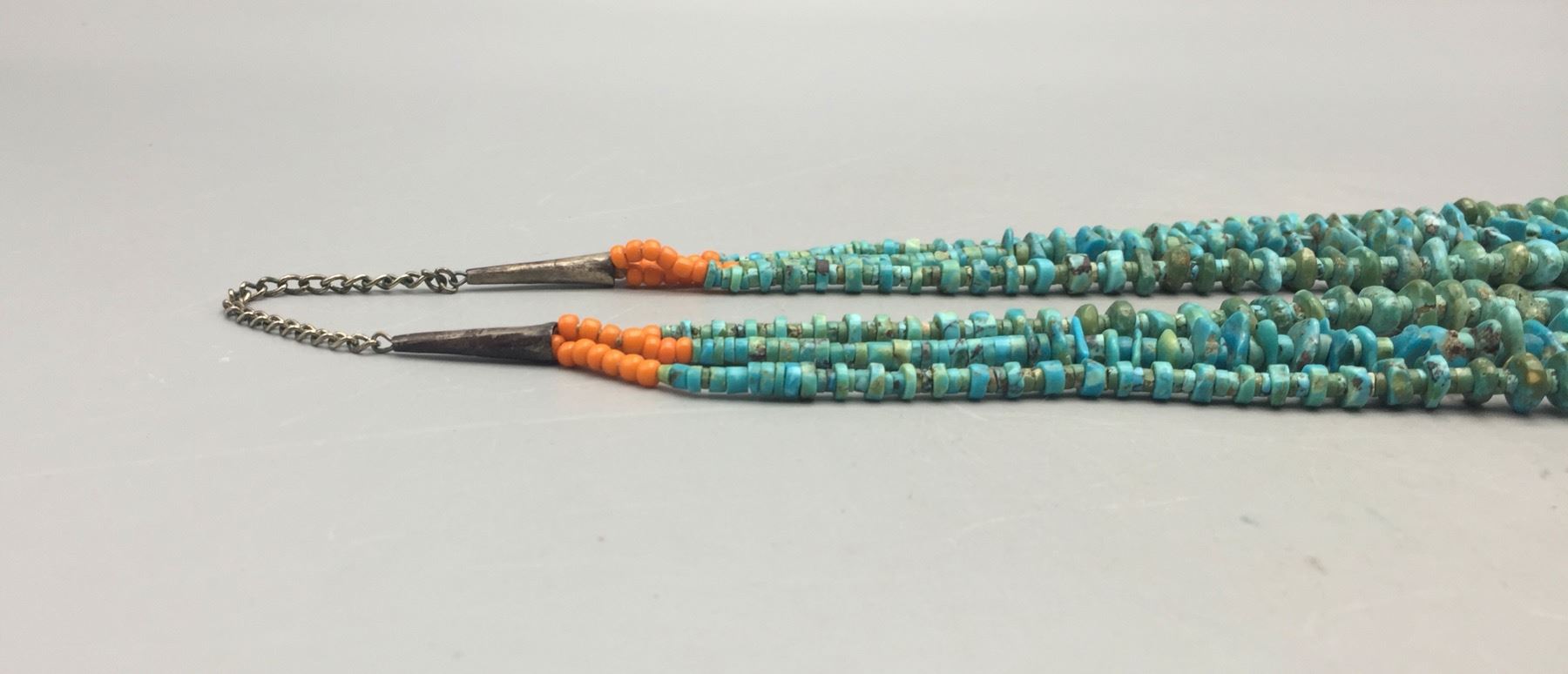 Description: Presented for sale in this lot is a great older three-strand turquoise necklace. It has two different styles HANDMADE turquoise beads and is accented with orange beads and sterling silver findings near the closure are behind the neck. The handmade turquoise beads are changing various shades of blue green due to age. Maker: Unknown. Approx. Age: Circa mid-century. Size: Fits a 25 inch neck. Weighs 178.9 grams. Condition: Good for its age, normal wear expected. Please look closely at the pictures - they are an important part of our description. Shipping: There will be a $5 handling, packaging fee for shipping this lot. The actual cost of postage will be added on top of that.