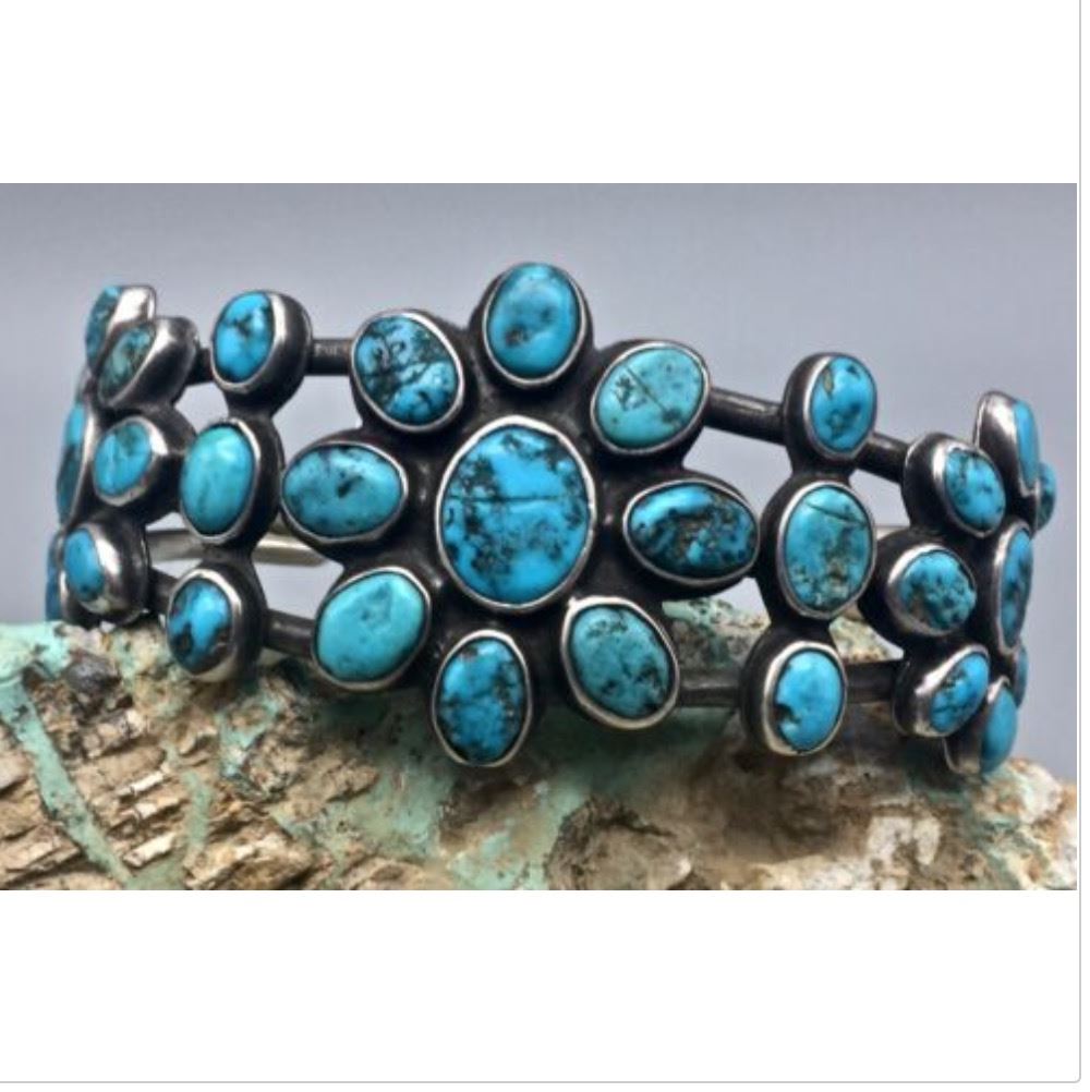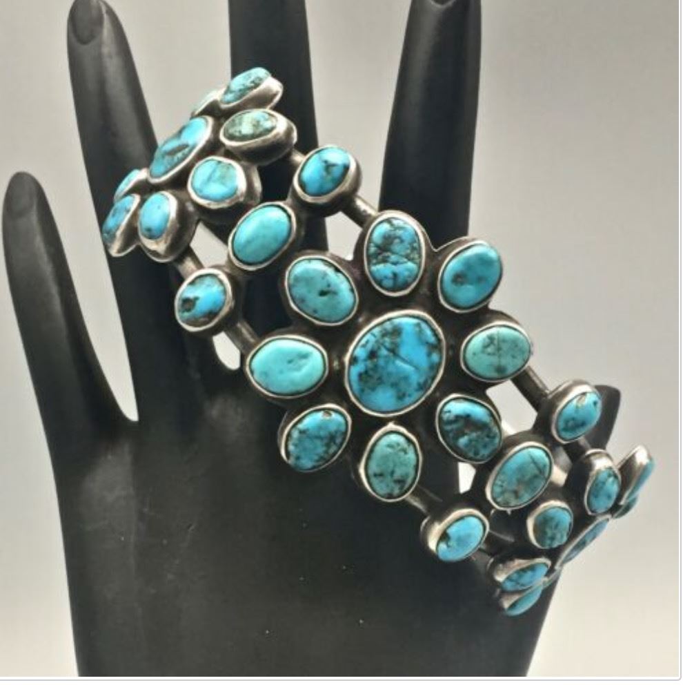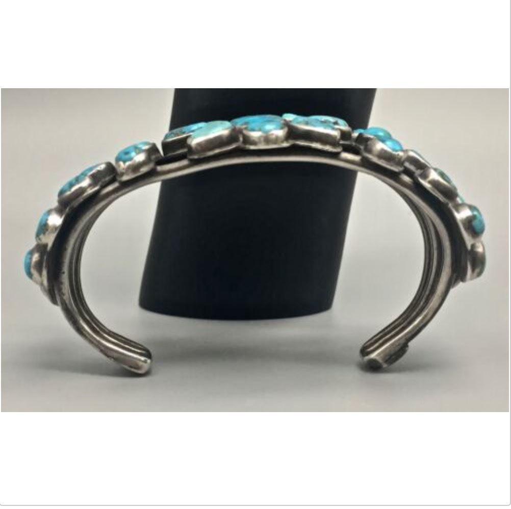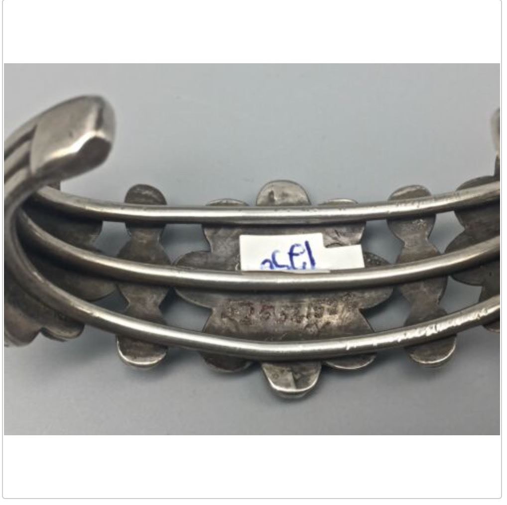 Description: For sale in this lot is a handmade silver bracelet featuring beautiful, old, natural turquoise cabochons. Tested as sterling silver. Maker: No hallmark, but appears to be Navajo or Zuni. (Trader codes etched into the back side of the cuff.) Approx Age: Vintage to Antique (Circa 1920s - 30s). Size: Inside circumference measures 5 1/2 inches plus there is a 1 1/2 inch gap (making it fit an approx. 7" wrist). It measures 1 1/2 inches at its widest point. Weighs an impressive 75.2 g. Condition: Good for its age, normal wear expected and small fissures in the natural turquoise stones are to be expected. Please look closely at the pictures as they are an important part of our description. Shipping: There will be a $5 handling / packaging fee for shipping this lot. The actual cost of postage will be added on top of that. BUY IT NOW: If you would like to buy this item now without waiting for the auction to end (this option is only available up to 48 hours before the auction starts to close), the “Buy it Now” price is the high estimate of this lot. If you would like to end the auction early and pay the high estimate (plus applicable fees), please contact us by phone or email and reference this lot.
