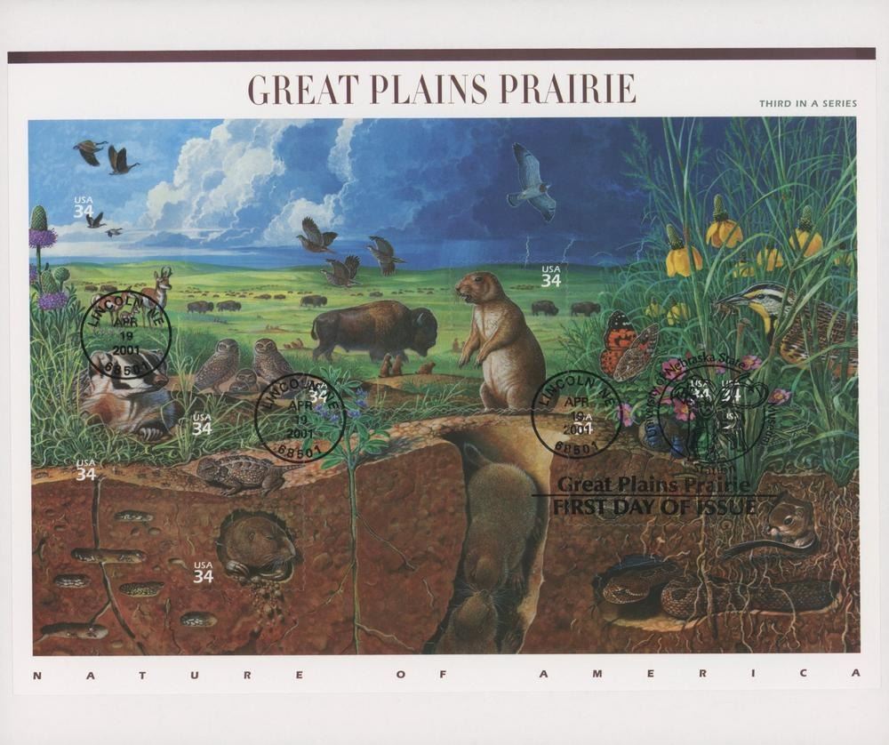 Great Plains Prairie (Nature of America), Full Sheet of 10 x 34-Cent Postage Stamps, USA 2001, Scott 3506, First Day Cover