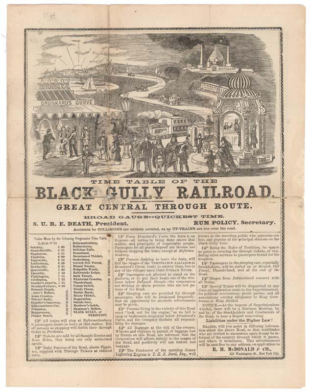 Printed Temperance Pamphlet Four page, 8 5/8” x 11”. Great carnival themed image of the Black Gully Railroad” and Drunkard’s Curve” at top of first page and image barroom at center of second page. The pamphlet warns against the dangers of alcohol. It reads, in part: All trains will stop at Reformationburg if passengers desire to leave at that station. But all persons so stopping with forfeit their through ticket to Perdition ... Daily patrons of the Road, above Tippleton, supplied with Through Tickets at reduced rates ... Stages for Tobaccoland connect with all trains ... Final page of pamphlet contains a long advertisement for vinegar bitters. Very Fine.
