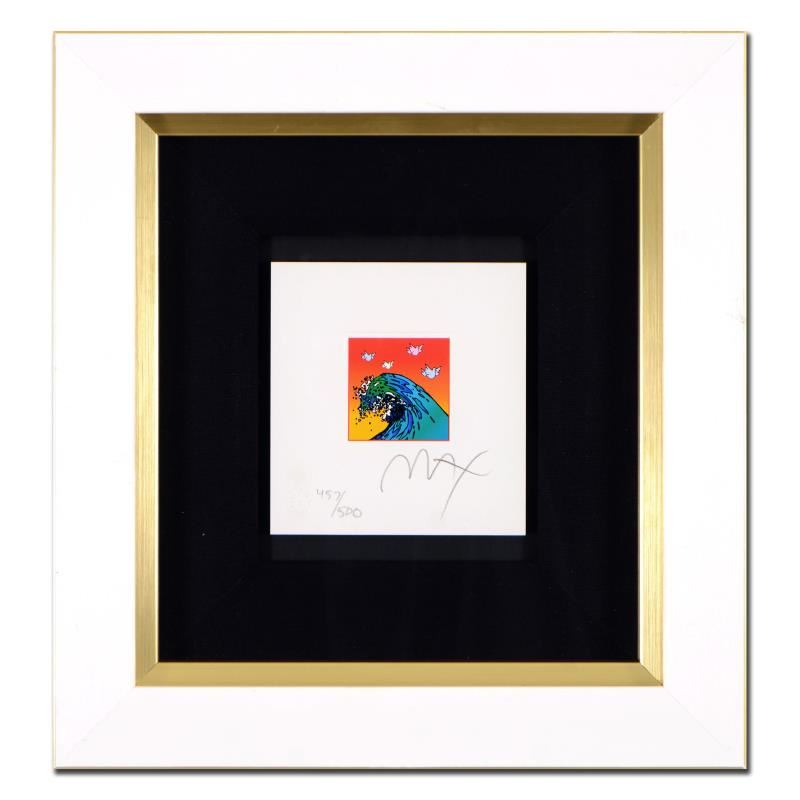 "Great Wave with Doves" is a limited edition lithograph on paper by Peter Max, numbered 457/500 and hand signed by the artist. This piece comes framed. Includes Letter of Authenticity. Measures approx. 12"x 13" (frame), 4"x 4" (image).