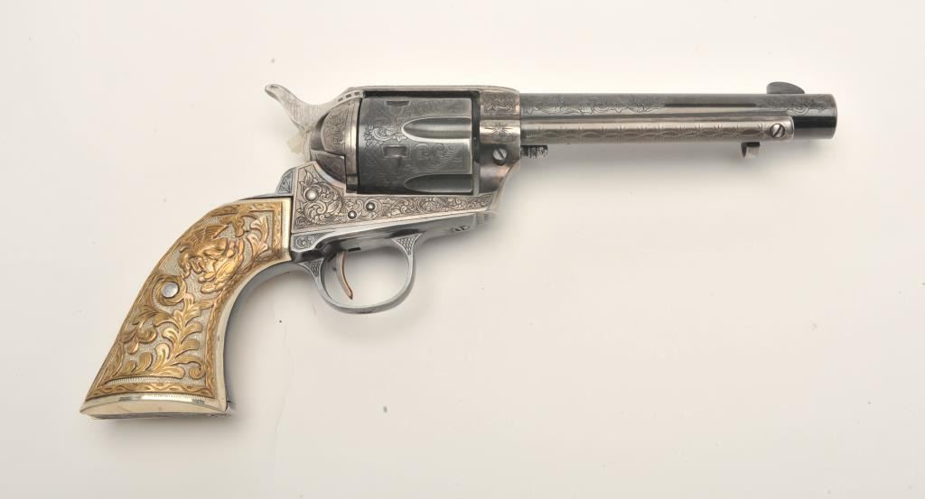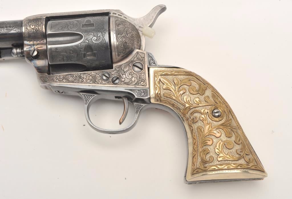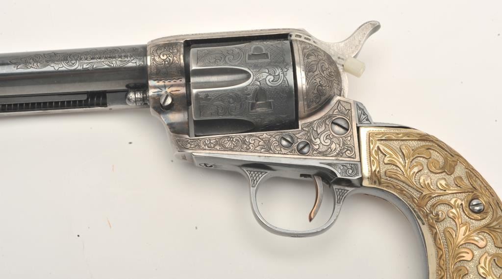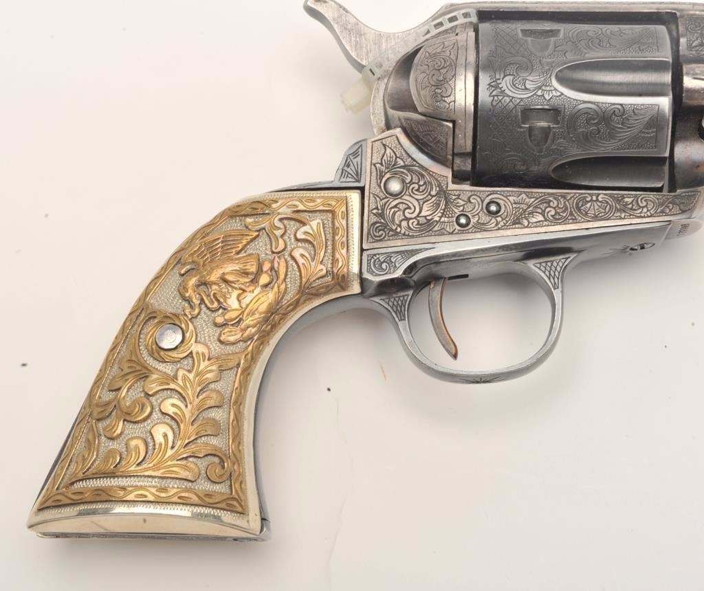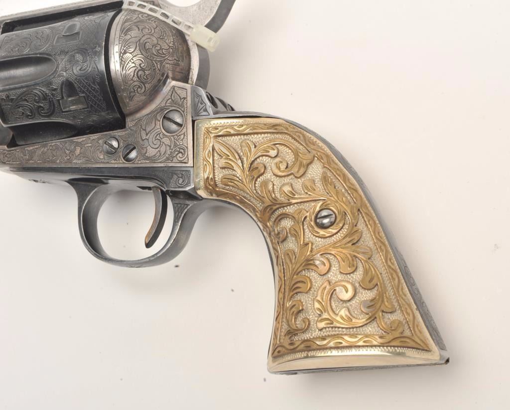 Great Western Arms Co. SAA revolver, .22 caliber, custom engraved by Mike Gouse from the Bitterroot Valley of MT., blued and case hardened finish, silver plated Mexican snake and eagle grips, S/N GW6520, in overall verygood to fine condition as customized, crisp action, sharp markings and beautifully accomplished fancy grips. (Modern/No PPT). Est.: $800-$1,600.