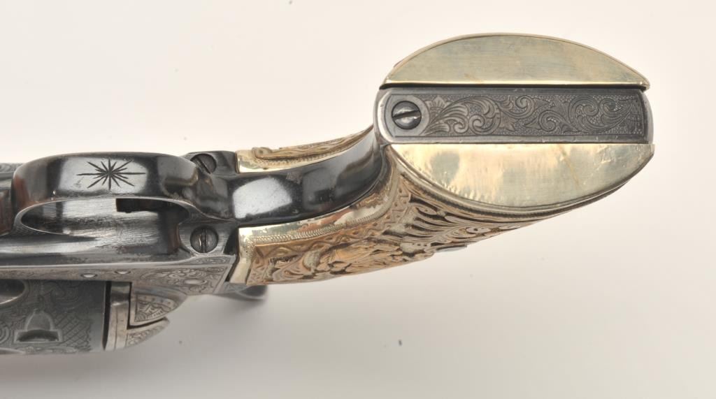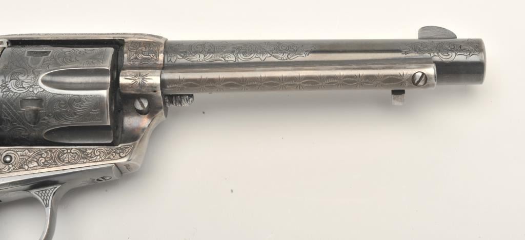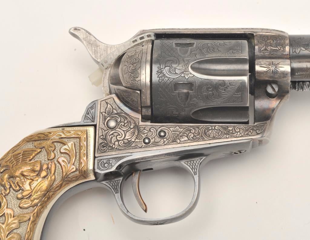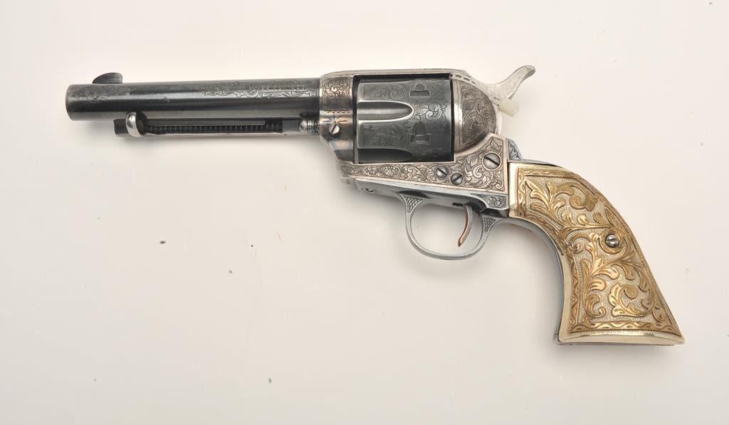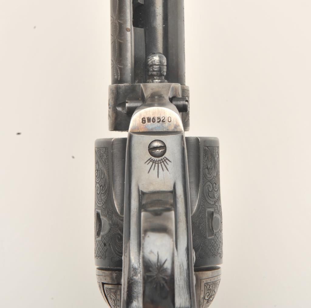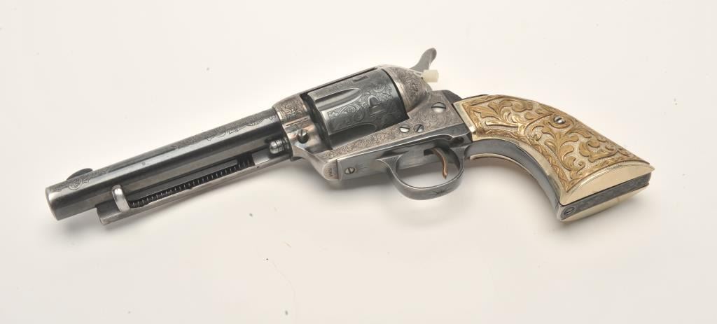 Great Western Arms Co. SAA revolver, .22 caliber, custom engraved by Mike Gouse from the Bitterroot Valley of MT., blued and case hardened finish, silver plated Mexican snake and eagle grips, S/N GW6520, in overall verygood to fine condition as customized, crisp action, sharp markings and beautifully accomplished fancy grips. (Modern/No PPT). Est.: $800-$1,600.