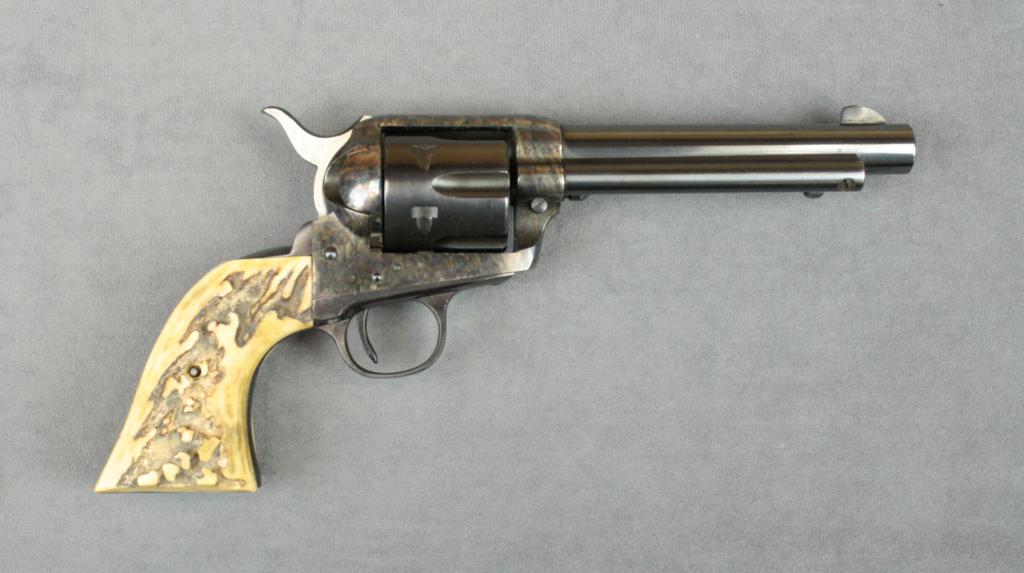 Great Western Arms Co. copy of a SAA  revolver, .22 cal., 5-1/2” barrel, blue and  case hardened finish, stag grips, #GW4231.  This gun is in overall excellent condition  showing the majority of the original finish,fine bore, crisp action, fine grips.  Est.:   $200-$400.
