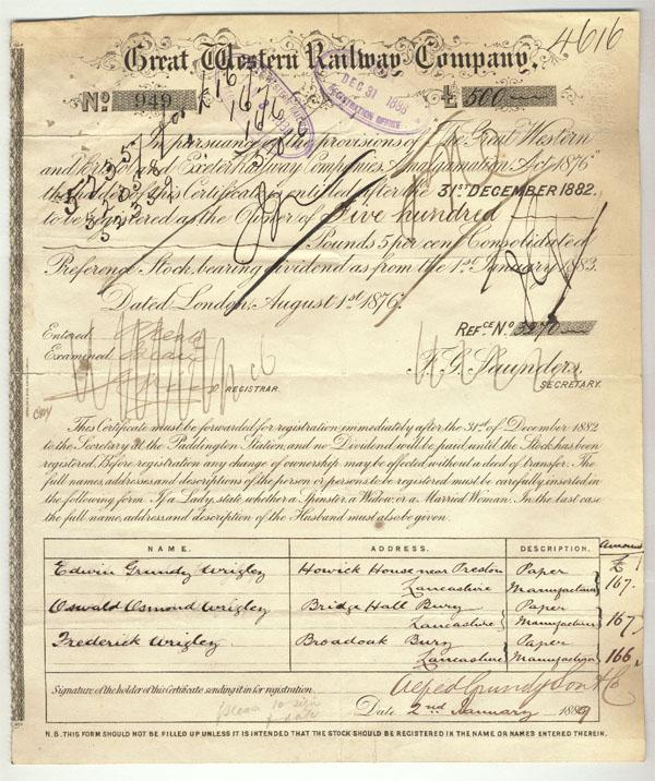 1883, England. 5 per cent consolidated preference stock. Pen and stamp cancelled.