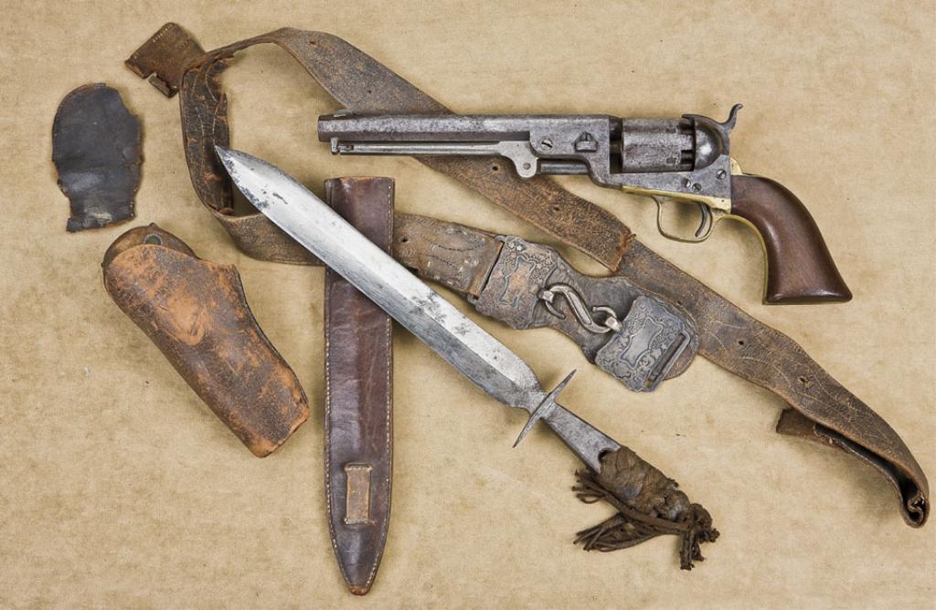 Great Western frontier set including a Colt Model 1851 Navy revolver, cut-down leather holster marked “_orhr, Maker, Atchison, Kansas” with old leather belt, serpentine engraved metal belt buckle, hand made un-marked bowie knife with leather scabbard. The gun is .36 cal., 7-1/2” octagon barrel, blue and case hardened finish, wood grips, #87267. This gun is in overall good condition showing a dark patina with scattered erosion and pin prick pitting, clear markings, good action, bore should clean to good, pleasing patina to brass straps, good grips with some wear and scattered small mars from carry and storage; all matching visible serial numbers except the rammer that is numbered “6782; classic period replaced silver blade front sight and base. The holster is well-worn and dry but shows the majority of its maker’s stamping; the belt is worn and dry and separated into several pieces that deserve careful professional conservation; the belt buckle parts are classic cast and engraved in the style of the 1850’s to 1860’s; the unmarked scabbard for the hand made knife is worn and not maker marked; the hand forged knife is unmarked and approx. 15” overall with a 10” blade; it has an integrated grip and cross guard and the top grip is partially wrapped in an old knotted fabric with tassels at the pommel. This rig has a great look and could have been the property of anyone from a buffalo hunter to a lawman, outlaw or frontiersman. Est.: $2,500-$5,000.