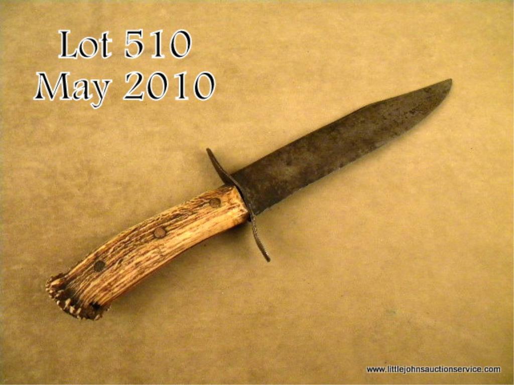 Great antique large hand-made unmarked Bowie knife, approx. 14-1/2" overall with an 8-1/2" blade and copper riveted stag horn grips in overall good untouched condition; the blade shows a dark brown patina with scattered spots oferosion and slight pitting; simple iron cross guard that is loose; wide tang between the two halves of the stag grips that show classic wear. We would date this knife to the mid-1800s and has a great look. Est.: $300-$500.