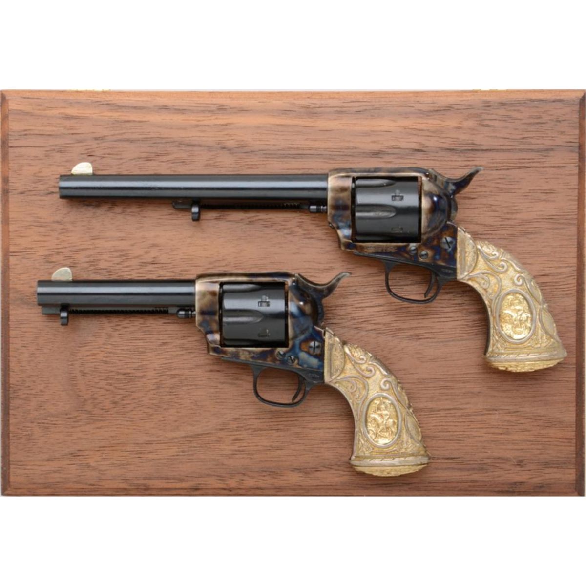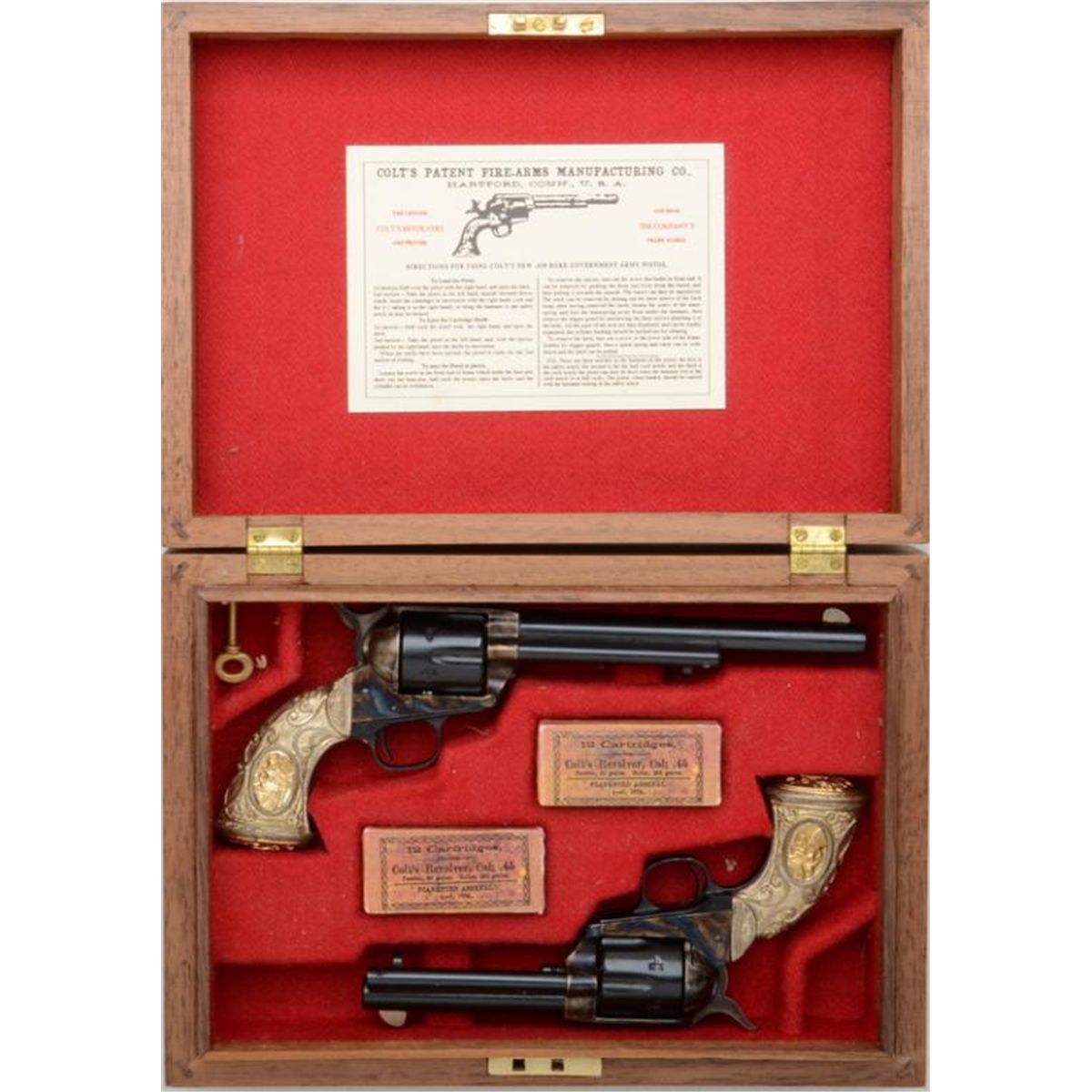 Great cased pair of miniature SAA revolvers, Colt marked but no Italian proofs, likely made by the Imperial Armoury; both guns are in excellent condition showing little handling and both with Tiffany-style grips;one is a 7-1/2” style barrel, #1061; the other is a 4-3/4” style barrel, #1052; wood display box is fine overall with red lined interior, lid label and two inset miniature copies of 12 cartridge ammunition boxes.Est.: $1,250-$2,500.
